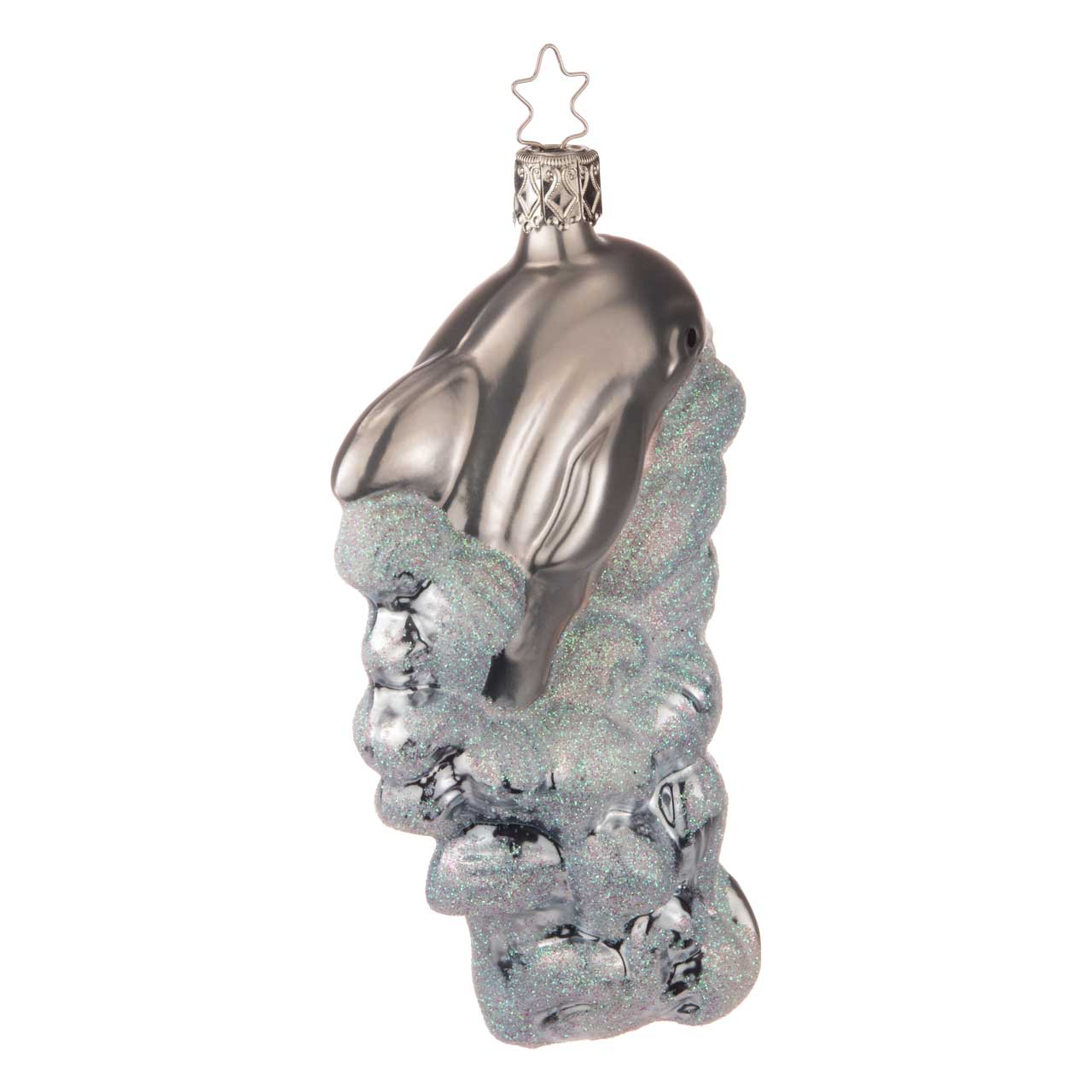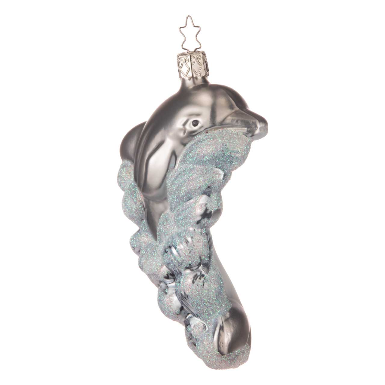 La figurine représente un dauphin aux reflets argentés qui s'élève avec élan hors des vagues scintillantes. Le corps a une forme élégante et est conçu en argent métallique, tandis que les vagues scintillent en bleu argenté étincelant. Une représentation à la fois dynamique et harmonieuse, dont les couleurs donnent une impression de fraîcheur et de noblesse