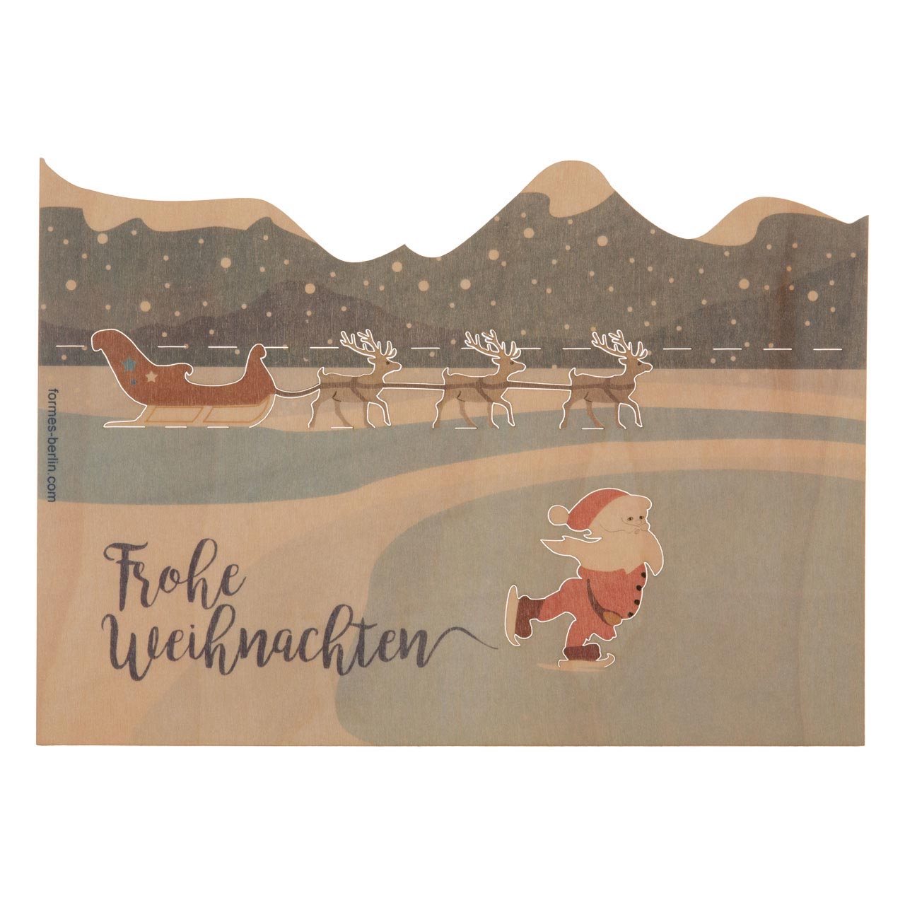 Un Père Noël qui patine, un traîneau avec un attelage de rennes derrière lui et un paysage hivernal enneigé - un motif tout à fait ordinaire. Pourtant, cette carte est très spéciale ! Fabriquée en bois de bouleau, elle a non seulement été imprimée en couleur, mais aussi découpée avec précision au laser, de sorte que le destinataire puisse plier les motifs vers le haut avec précaution, conformément aux instructions fournies. Le paysage hivernal prend alors forme !