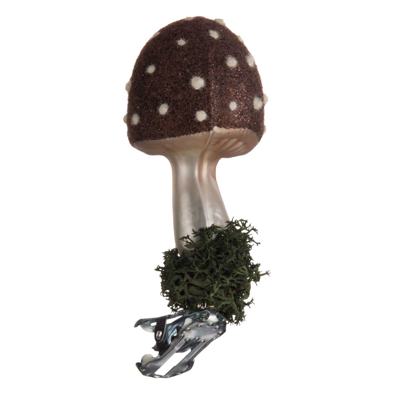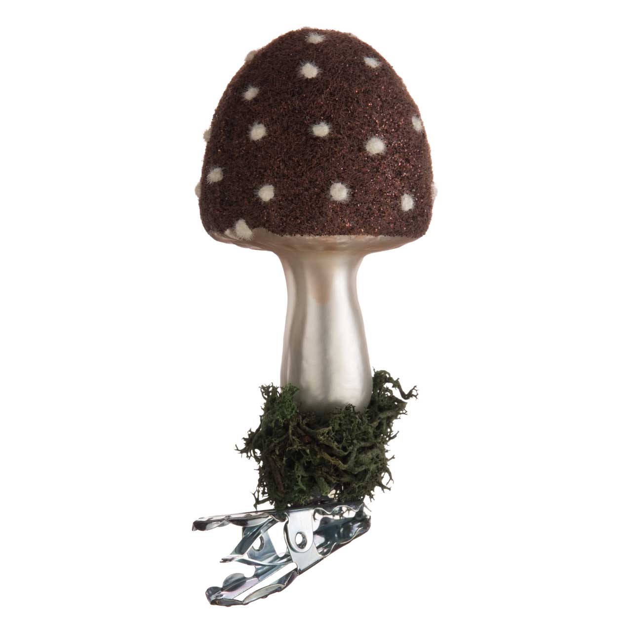 Cette version présente une amanite mouche brune avec une surface finement structurée, des points blancs et une tige aux reflets soyeux. Le pied est orné de mousse véritable, ce qui confère au design un caractère naturel et authentique. La combinaison du brun mat, du blanc nacré chaud et des scintillements délicats crée une élégance harmonieuse et terreuse.