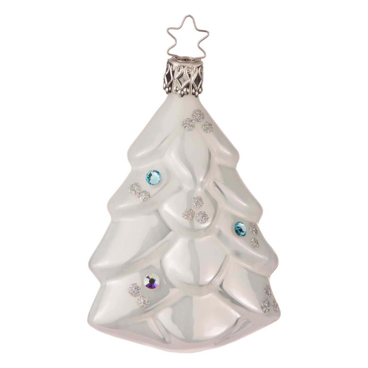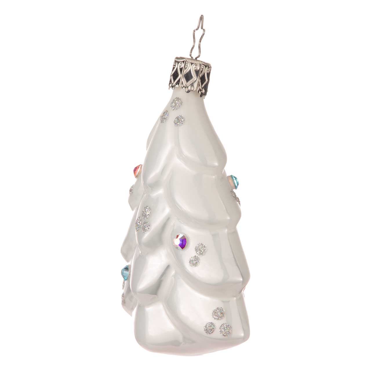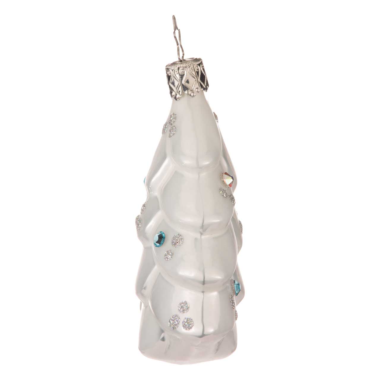 La boule présente un sapin stylisé d'un blanc nacré. Les branches incurvées sont parsemées d'accents scintillants argentés et de plusieurs pierres précieuses bleues qui ressemblent à de petits cristaux de glace. La forme est plate et clairement structurée, ce qui met particulièrement en valeur le motif élégant.