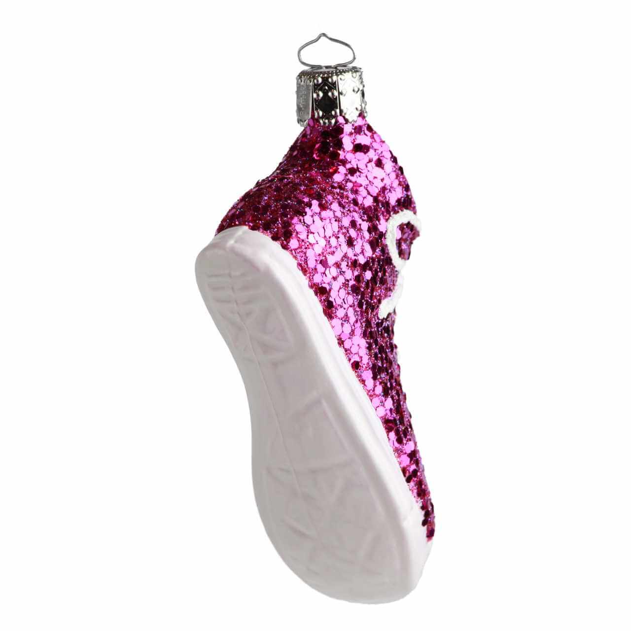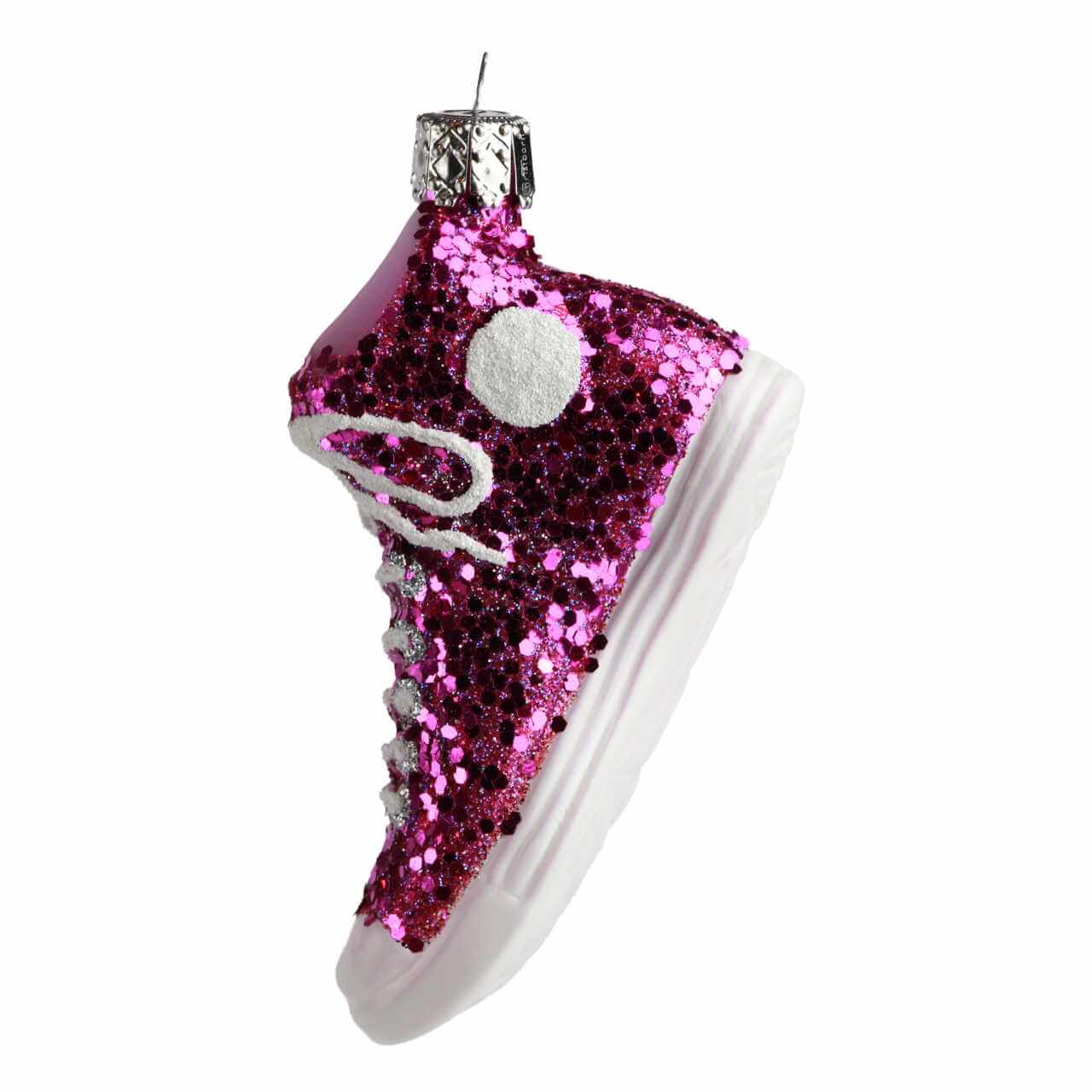 Qu'il s'agisse de baskets ou de sneakers - peu importe le nom qu'on leur donne - ces chaussures de sport à la semelle et au bout blancs bien marqués font depuis longtemps partie des classiques de l'habillement des pieds. Mais pas seulement sur la jambe - les chaussures populaires font aussi une figure extrêmement chic sur le sapin. Bien sûr, elles ne sont pas usées et rances, mais soufflées avec art dans du verre, vernies avec soin et parées de paillettes - tout simplement en accord avec la fête de Noël.