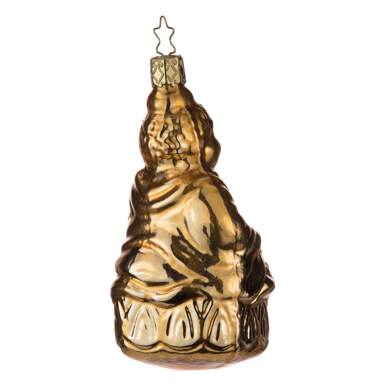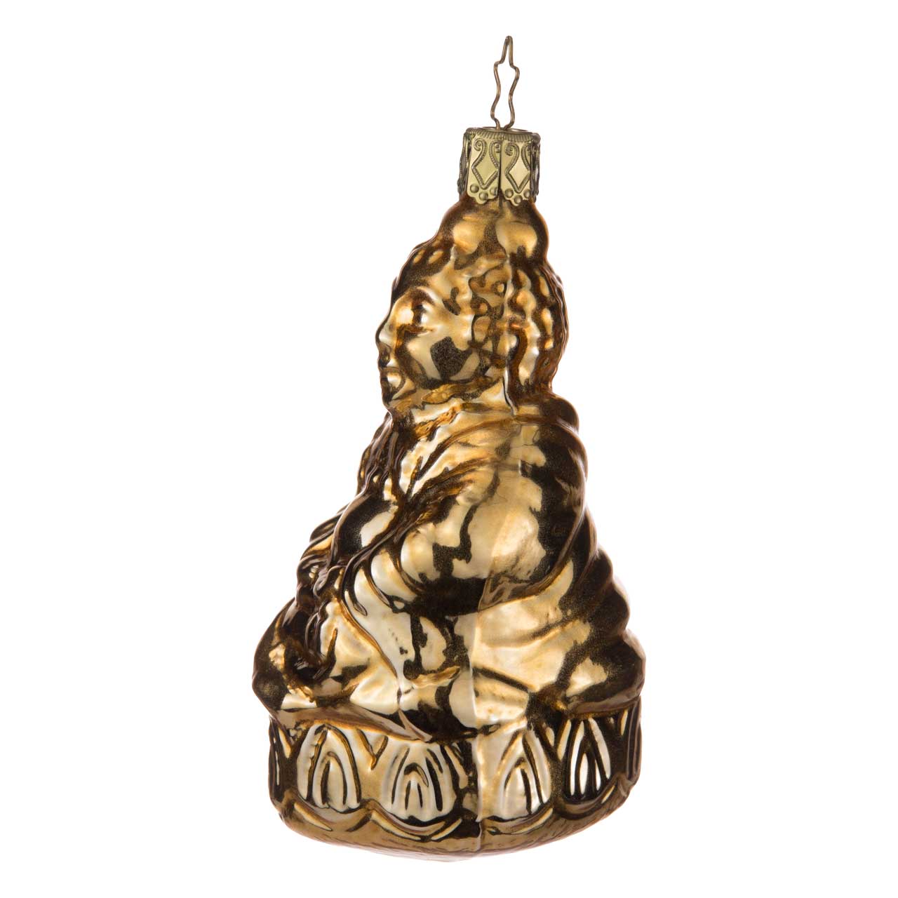 La figure montre Bouddha dans une position assise classique, entièrement en or brillant avec des nuances plus foncées qui soulignent les contours. Le socle est orné d'un motif décoratif qui met en valeur l'aspect solennel. La surface est brillante, ce qui rend le motif particulièrement noble.