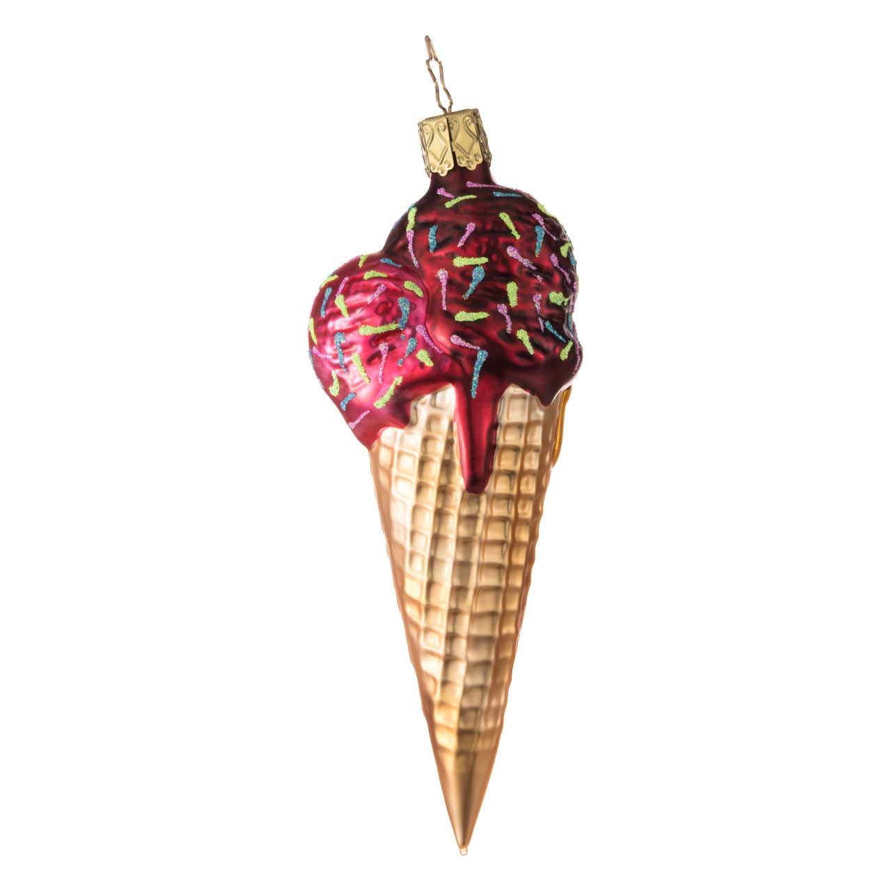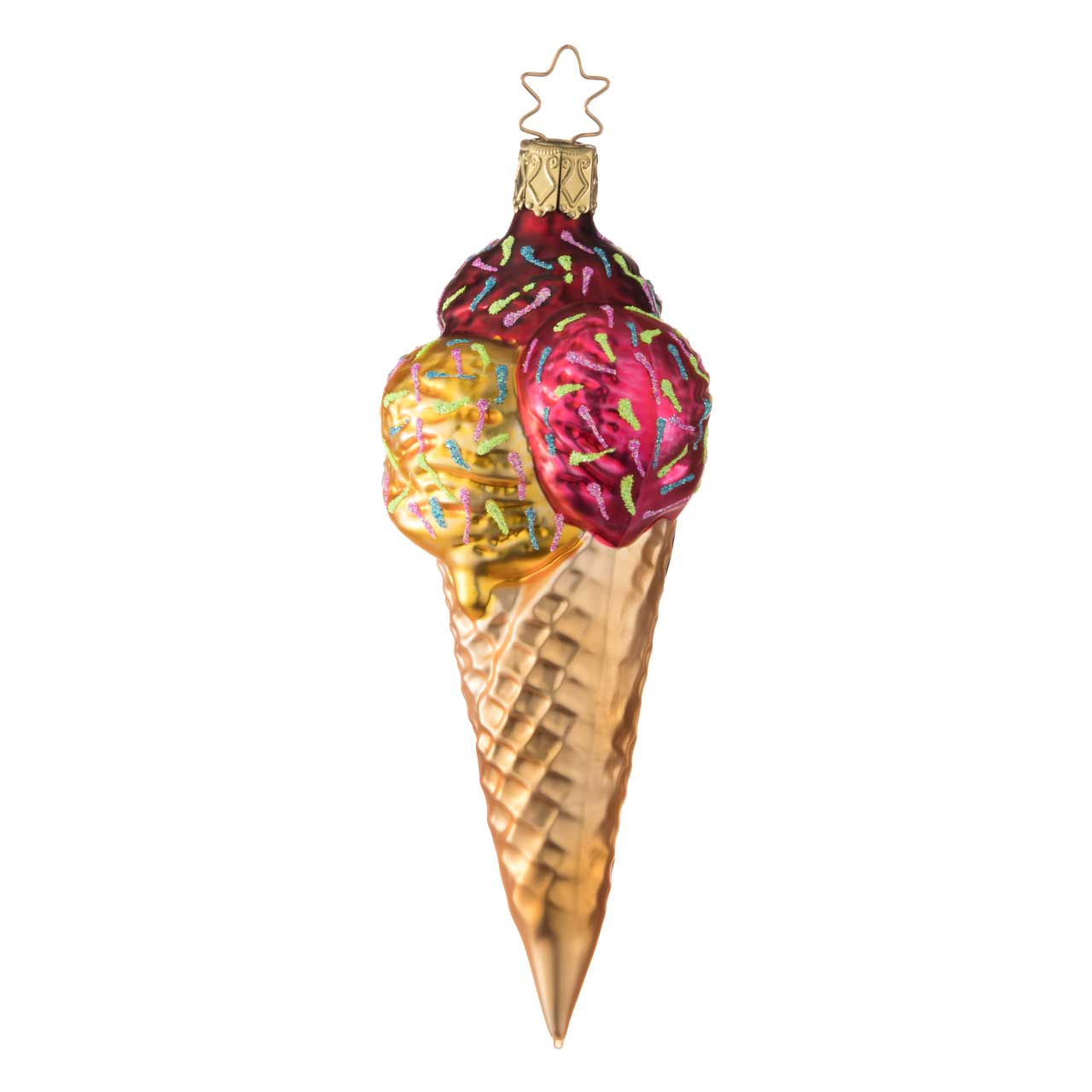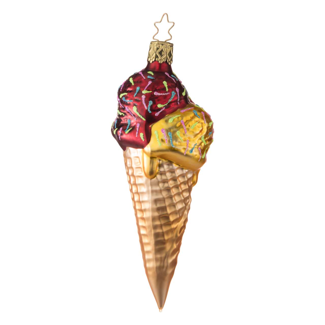 La figurine représente une gaufre allongée avec deux généreuses boules de glace d'un rouge vif et d'un jaune tendre, décorées de vermicelles multicolores. La gaufre elle-même est dans des tons chauds d'or et de beige et est structurée de manière détaillée, ce qui lui donne un aspect particulièrement vivant. La surface brillante souligne le caractère sucré et décoratif de la figurine.
