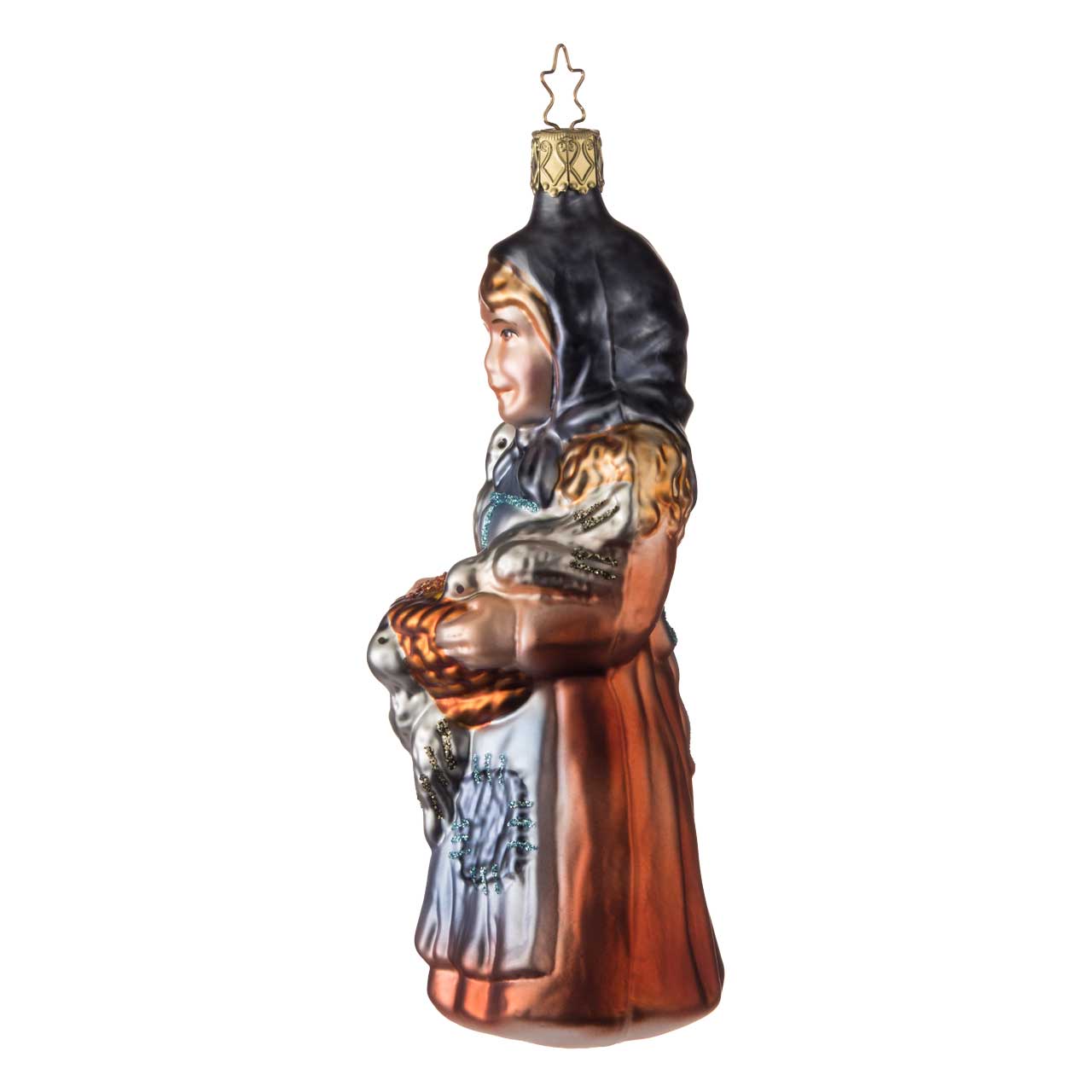 Cette représentation montre une figurine amoureusement conçue sous la forme d'une jeune fille portant un foulard et une robe chatoyante dans de douces nuances de gris, de bleu et de cuivre. Elle tient dans ses mains un bol de blé doré, entouré d'oiseaux argentés et brillants - un motif riche en détails, plein de magie féerique et de chaleur du cœur