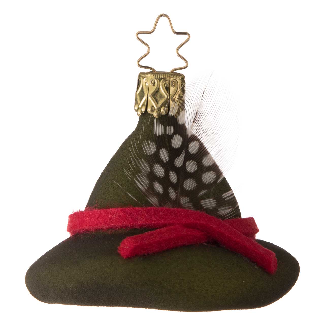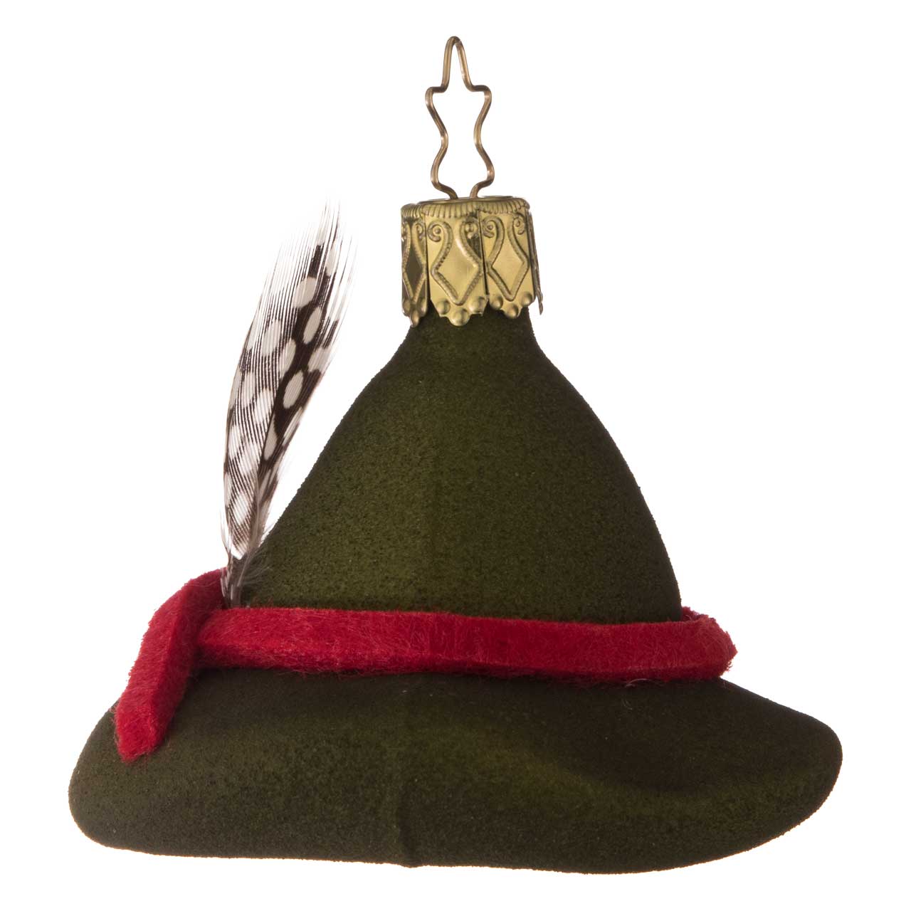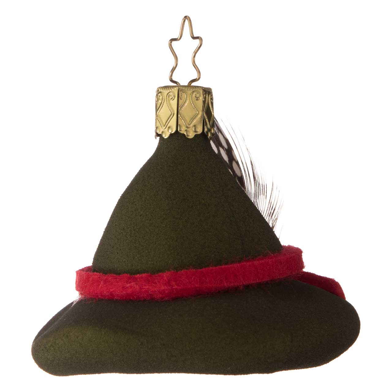 La figurine s'inspire d'un chapeau de garde forestier classique, avec un large bord et une couronne légèrement bombée. Elle se présente dans un vert profond et mat et est accentuée par un ruban rouge ainsi qu'une petite plume très détaillée. La boule allie un aspect textile doux à une forme claire, ce qui lui confère un aspect particulièrement authentique et charmant.