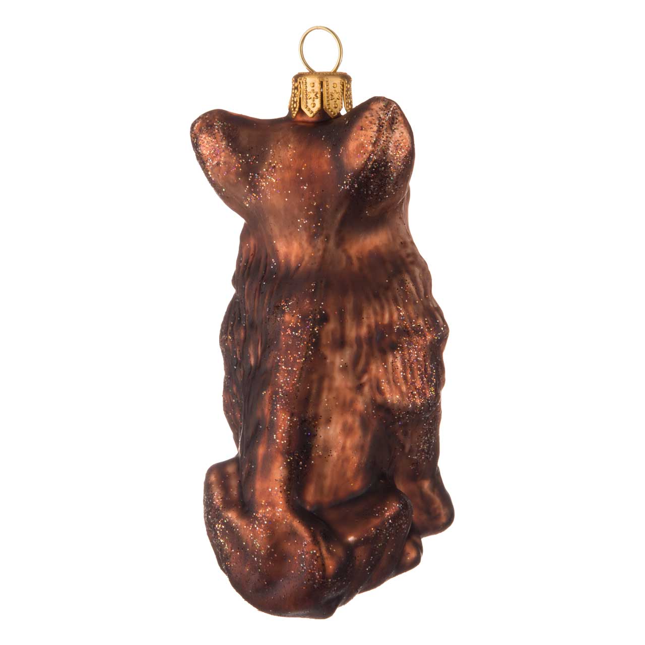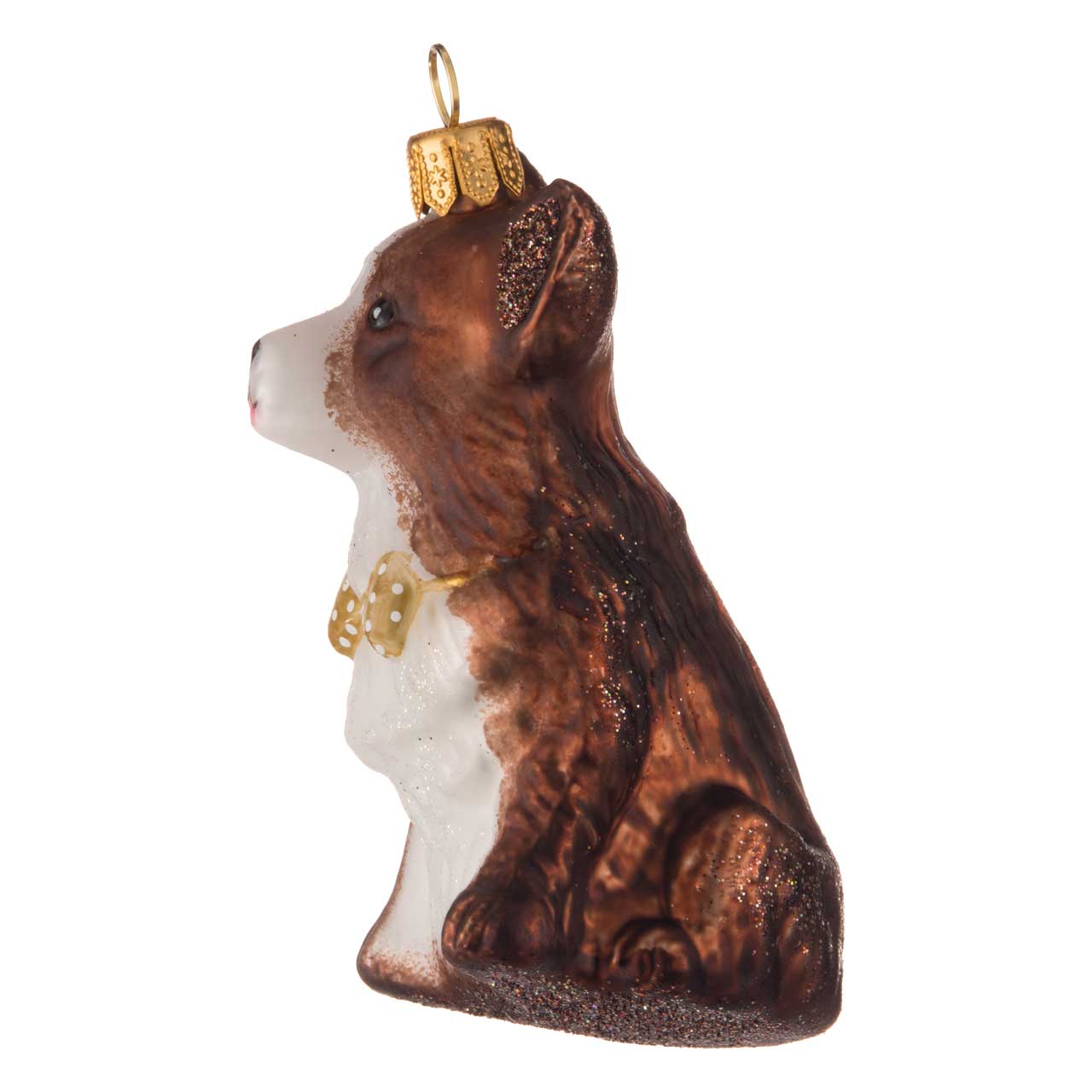 Le Corgi est assis tranquillement et son pelage est facilement reconnaissable. Le ventre et le museau sont marqués de blanc. Le dos est d'un brun foncé. Sur la poitrine se trouve une mouche dorée avec des points blancs.