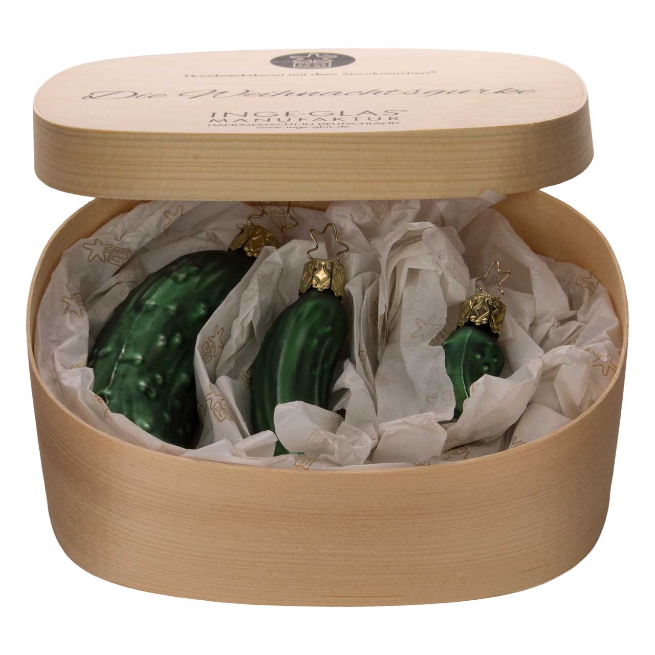 C'est en tout cas toujours amusant de cacher le petit légume en verre à l'apparence d'un cornichon dans le feuillage du sapin de Noël et d'offrir un cadeau supplémentaire à celui qui le découvre pour la première fois. Et avec ce set de trois, vous ne vous trompez jamais : en fonction des exigences, du talent, de la patience, de la persévérance et des capacités - bref, pour chacun - vous trouverez à coup sûr la bonne taille !