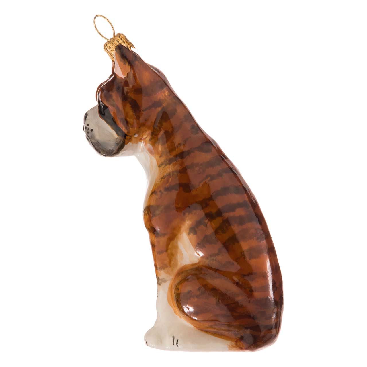 Comme un chien en porcelaine - c'est ainsi que brille ce boxer pour le sapin. Il se tient droit dans une pose assise typique et se balance du haut de sa petite couronne dorée.