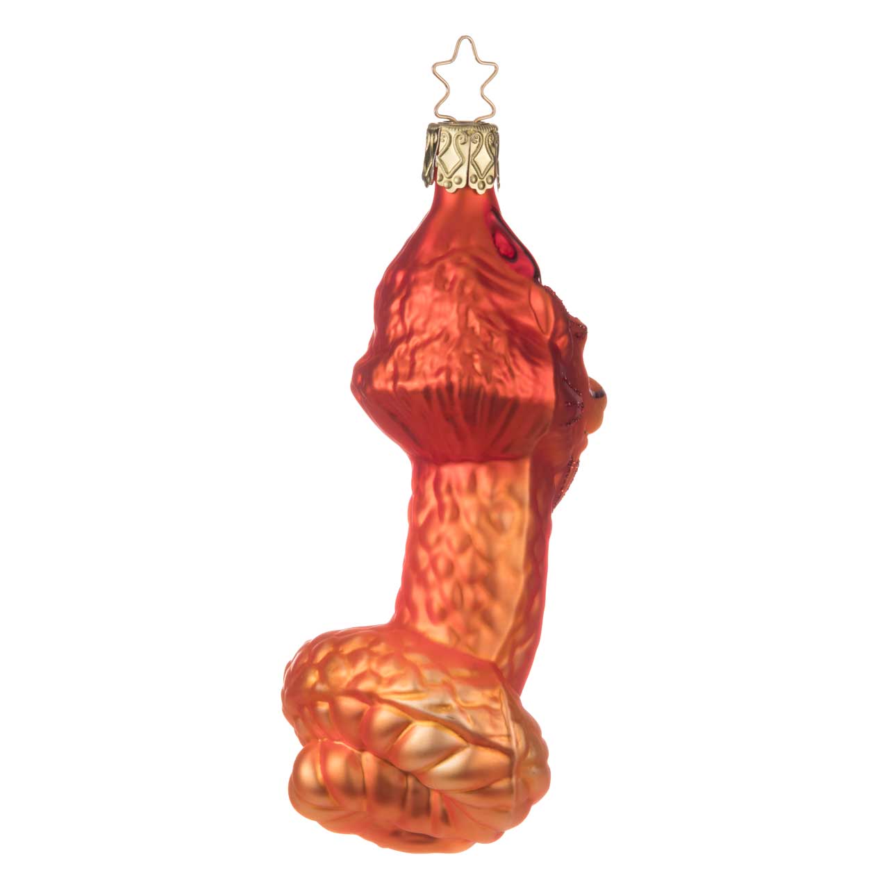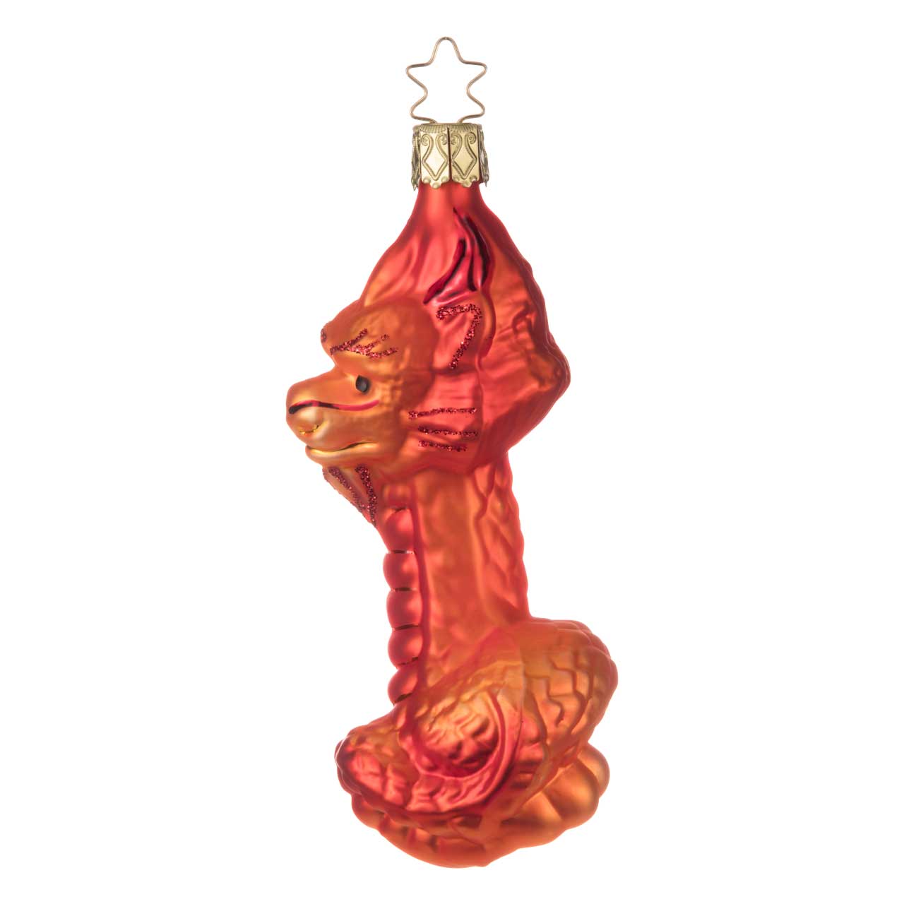 La figurine présente un corps de dragon incurvé d'un rouge-orange vif, rehaussé de touches dorées. Le dragon porte un visage richement détaillé avec des contours marqués et des ornements scintillants qui soulignent son expression mystique. Sa forme est allongée et légèrement sinueuse, ce qui donne une impression de mouvement et de vivacité. Un point fort lumineux avec un effet de couleur intense.