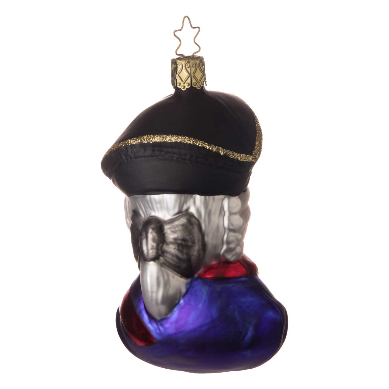 La boule de Noël représente le buste de Frédéric le Grand, richement détaillé. Avec des traits de visage fidèles à la nature, une perruque blanche bouclée, un tricorne noir à liseré doré et un uniforme bleu et rouge vif aux accents dorés, il est particulièrement impressionnant.