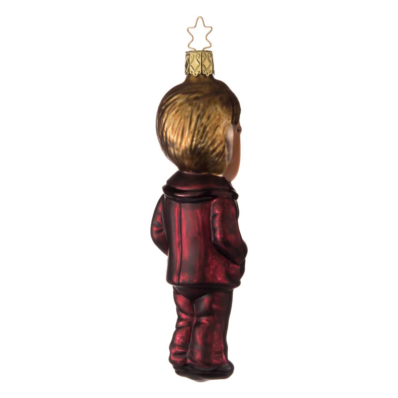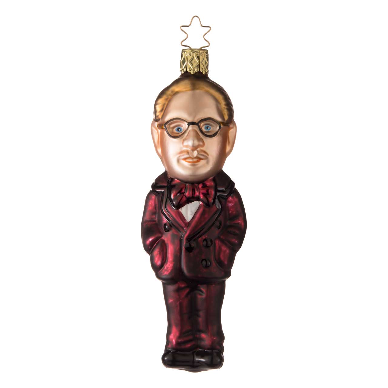 La silhouette est fine et allongée et représente un homme stylisé en costume. Côté couleurs, un rouge bordeaux profond et brillant domine pour le costume, combiné à des cheveux dorés, un teint clair et des détails noirs comme les chaussures et les lunettes. La boule a un aspect noble, légèrement ludique et se distingue clairement par sa forme figurative.