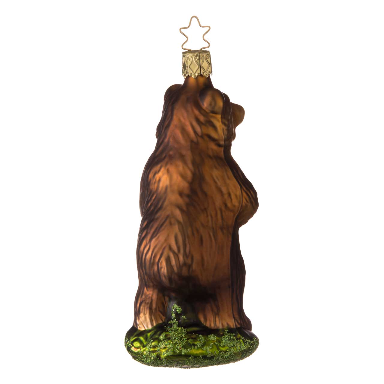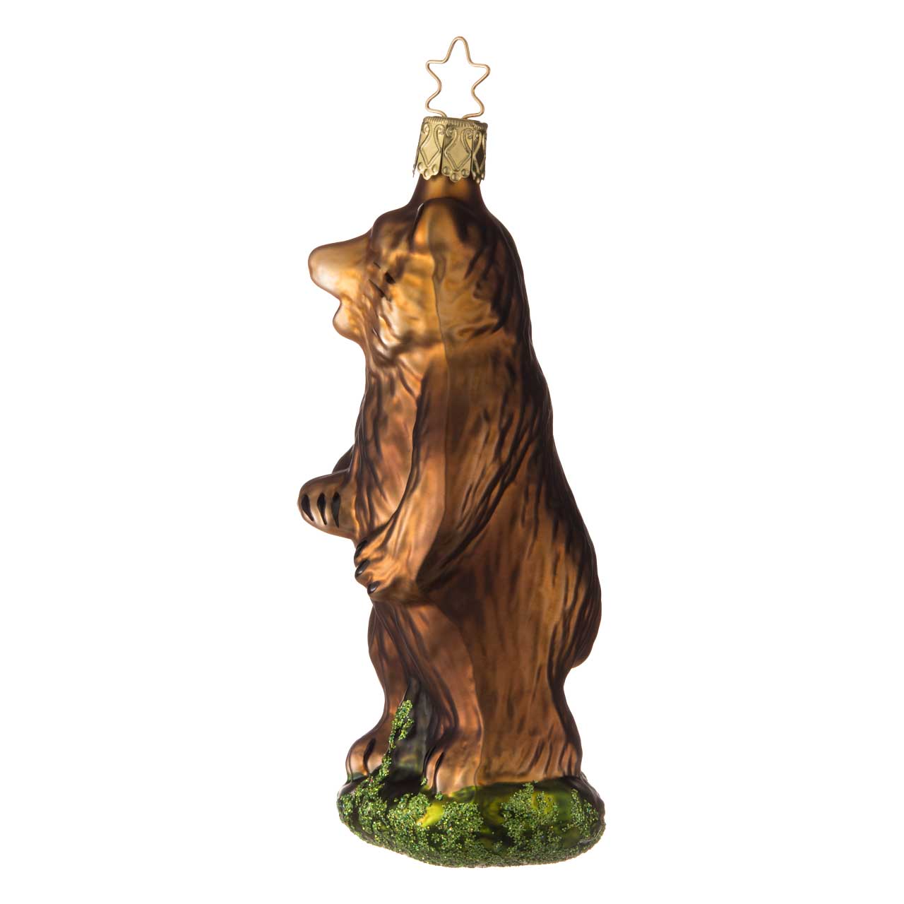 La figurine représente un grizzly debout, au pelage richement modelé et à l'expression amicale. Des nuances chaudes de brun et d'or dominent, complétées par des accents sombres pour la structure du pelage et un socle vert qui rappelle le sol de la forêt. La boule semble ainsi proche de la nature, vivante et en même temps agréablement rustique.