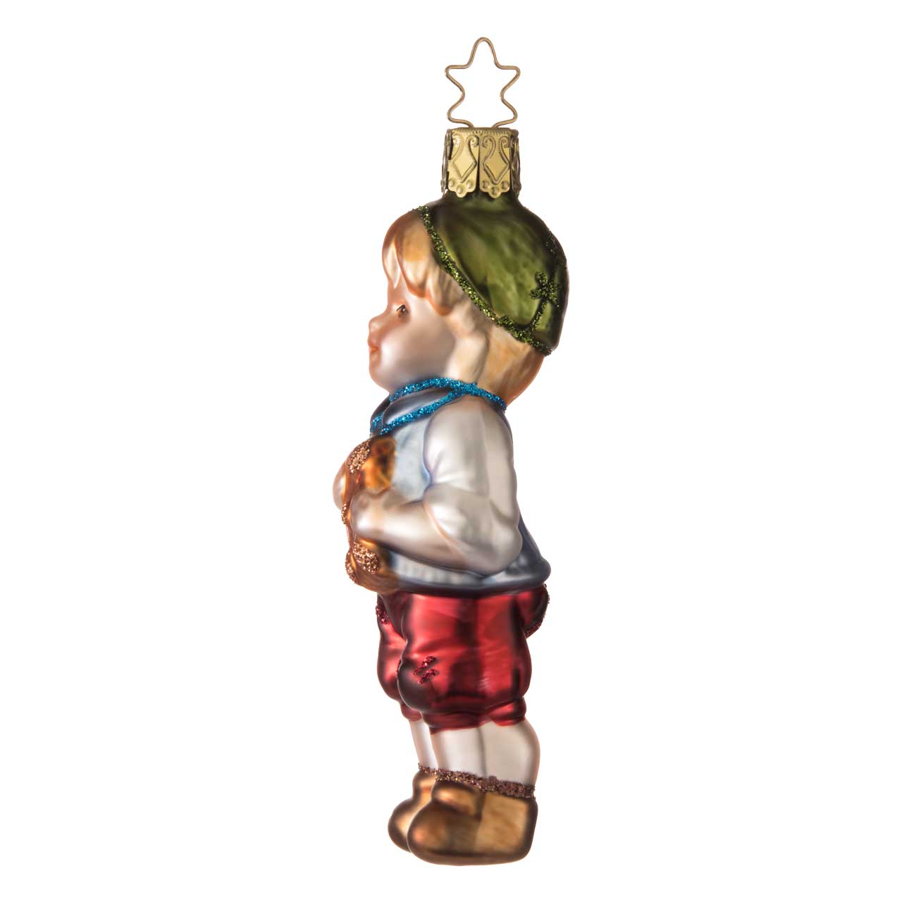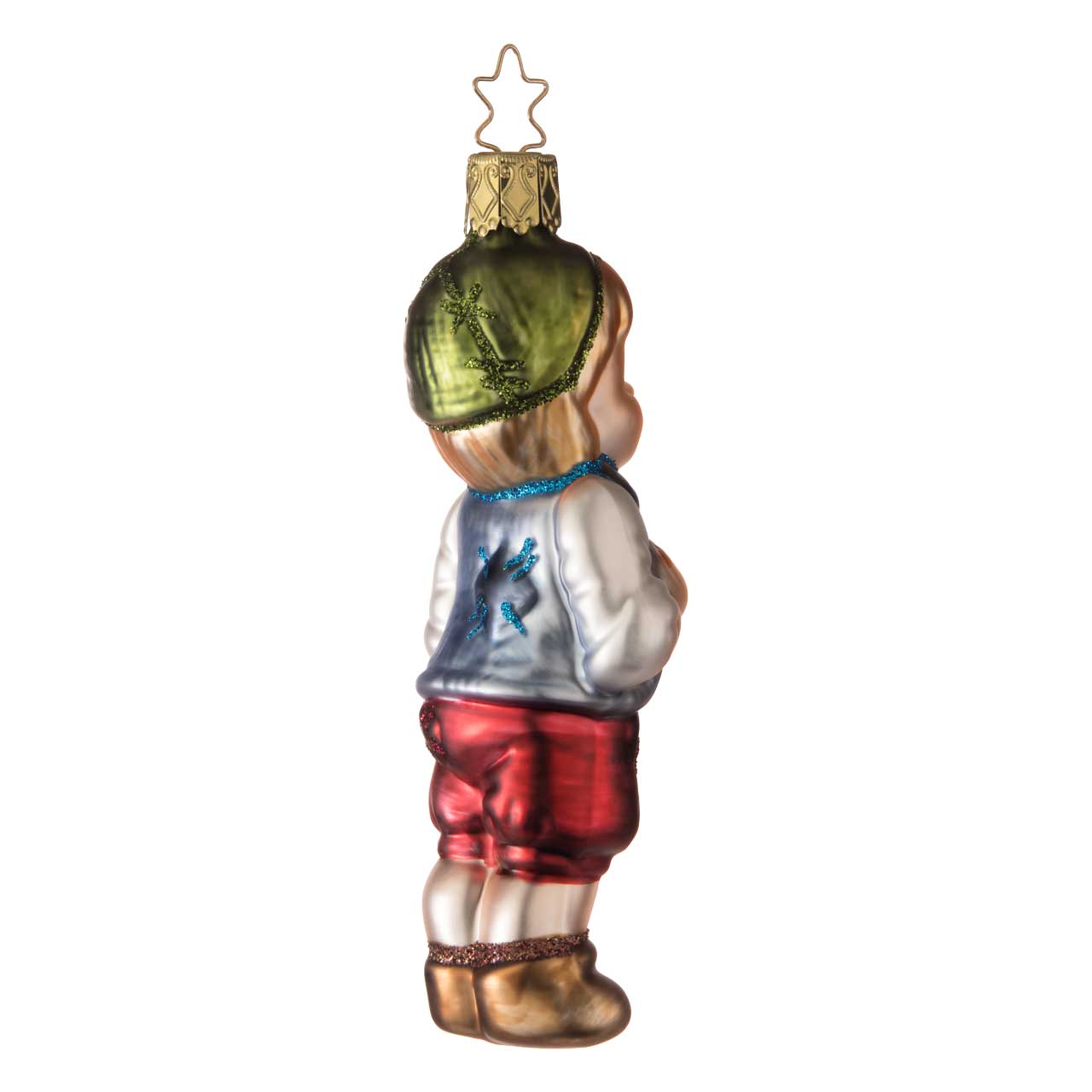 La boule représente un garçon debout, de forme allongée, avec des détails soignés. Les couleurs dominantes sont des tons chauds comme le rouge pour le pantalon, un blanc clair et légèrement brillant pour la chemise ainsi que des accents verts et dorés pour la casquette et les détails. Le personnage tient dans ses mains un morceau de pain d'épice brun et doré qui souligne encore le motif.