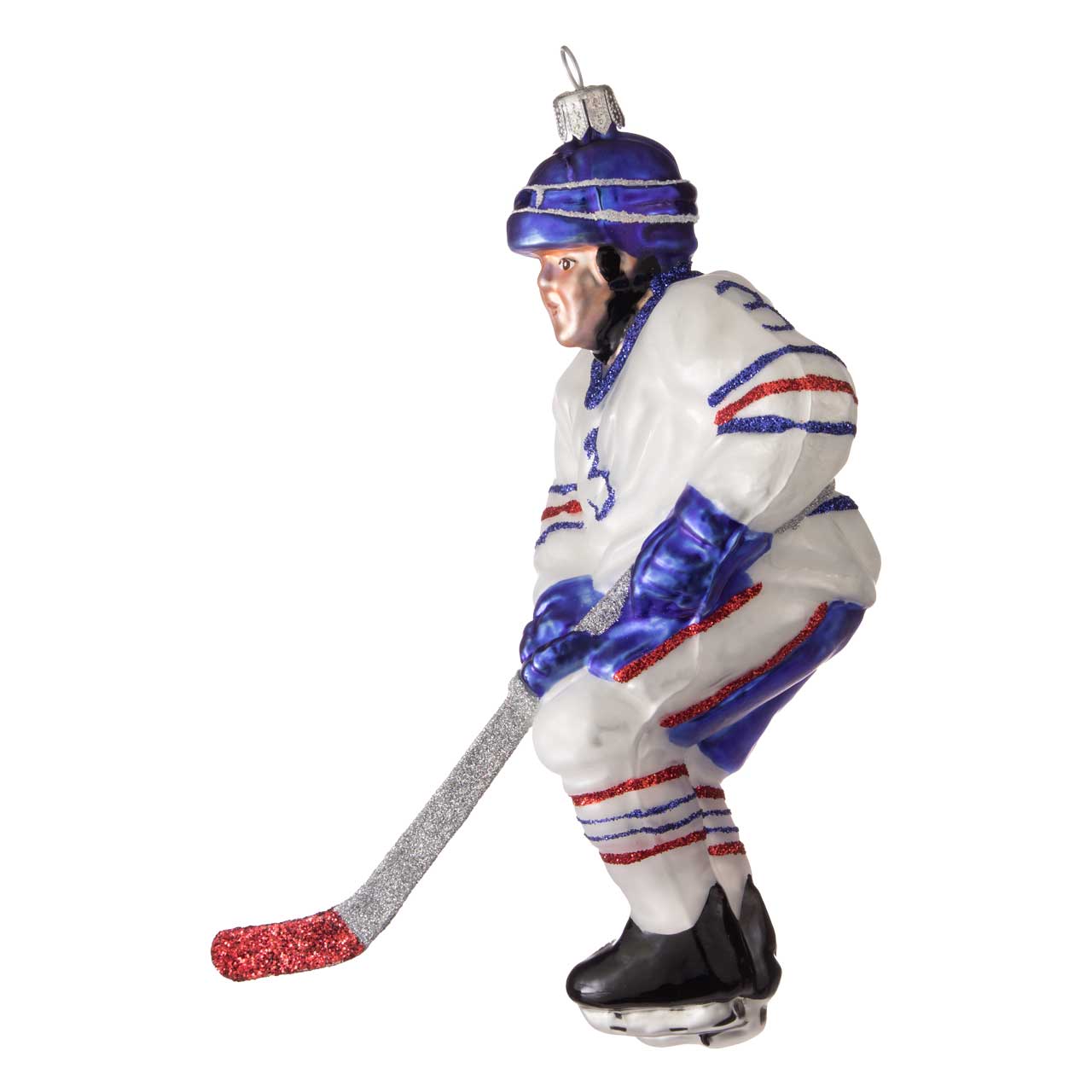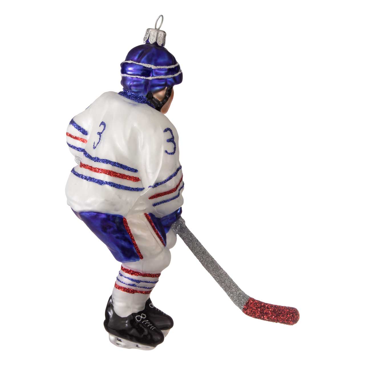 La représentation montre un joueur de hockey sur glace en pleine action, vêtu d'un maillot blanc avec des bandes scintillantes bleues et rouges. Le casque et les gants brillent d'un bleu vif, tandis que la crosse est décorée de paillettes argentées et rouges. Son attitude évoque le dynamisme et la concentration - comme s'il était en plein match.
