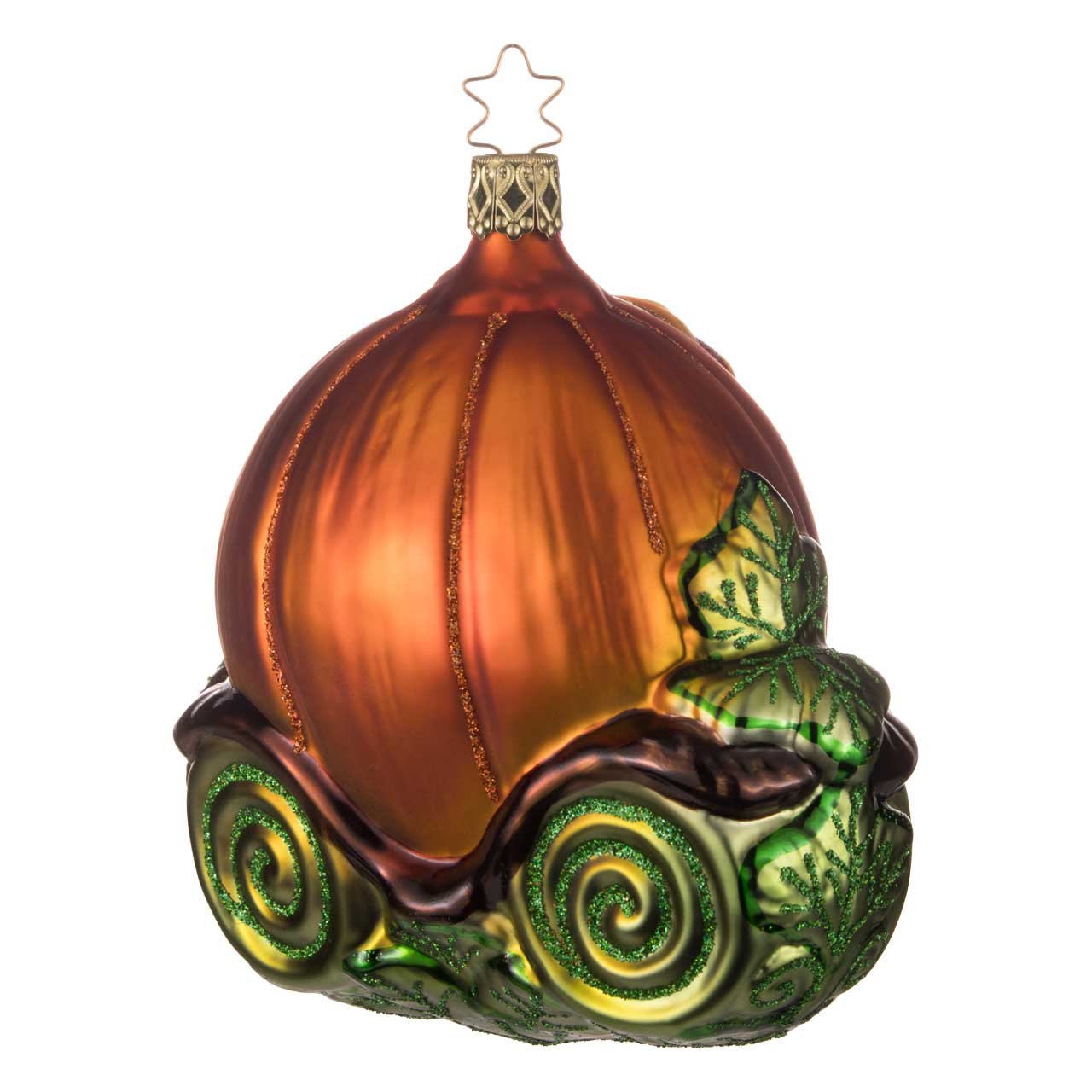 Calèche richement détaillée en forme de citrouille orange avec des roues et des feuilles vertes. Cendrillon, coiffée d'un diadème étincelant et tenant une chaussure en argent, est accoudée dans une fenêtre dorée. Conception colorée en orange, vert, or et rouge avec des accents scintillants.