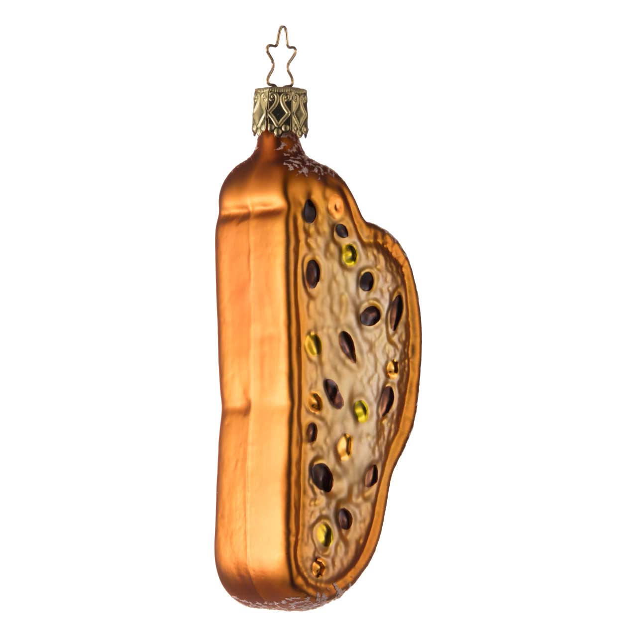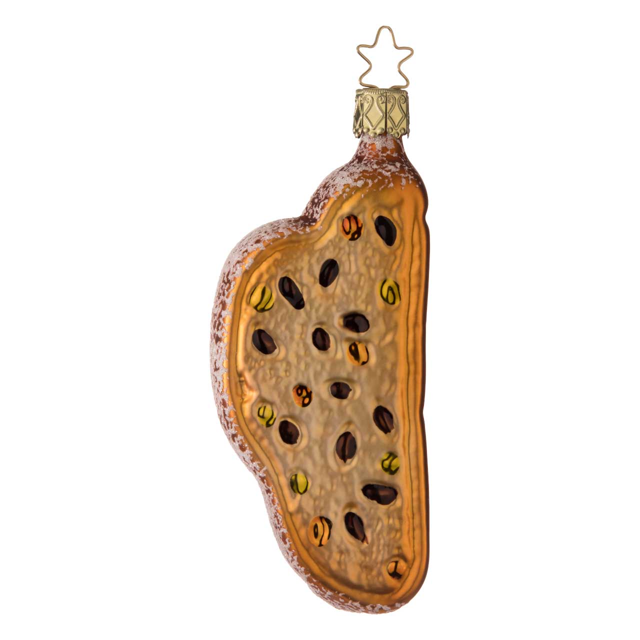 La boule a la forme d'un morceau de Stollen découpé et séduit par ses tons chauds d'or et de brun ainsi que par sa surface légèrement "sucrée". La surface de coupe claire est décorée de manière détaillée avec des morceaux de fruits foncés et jaunâtres, ce qui rend la figurine particulièrement vivante et appétissante.