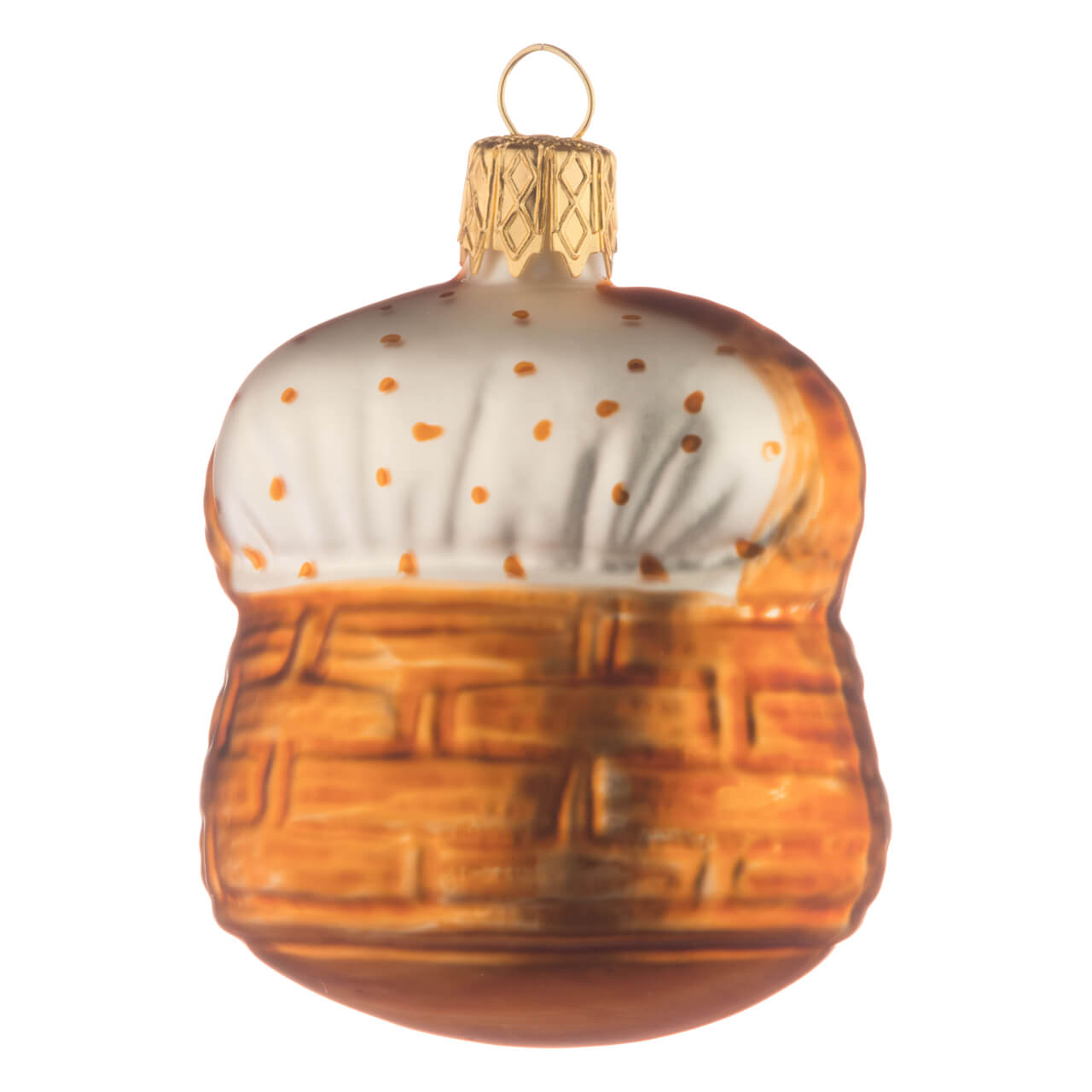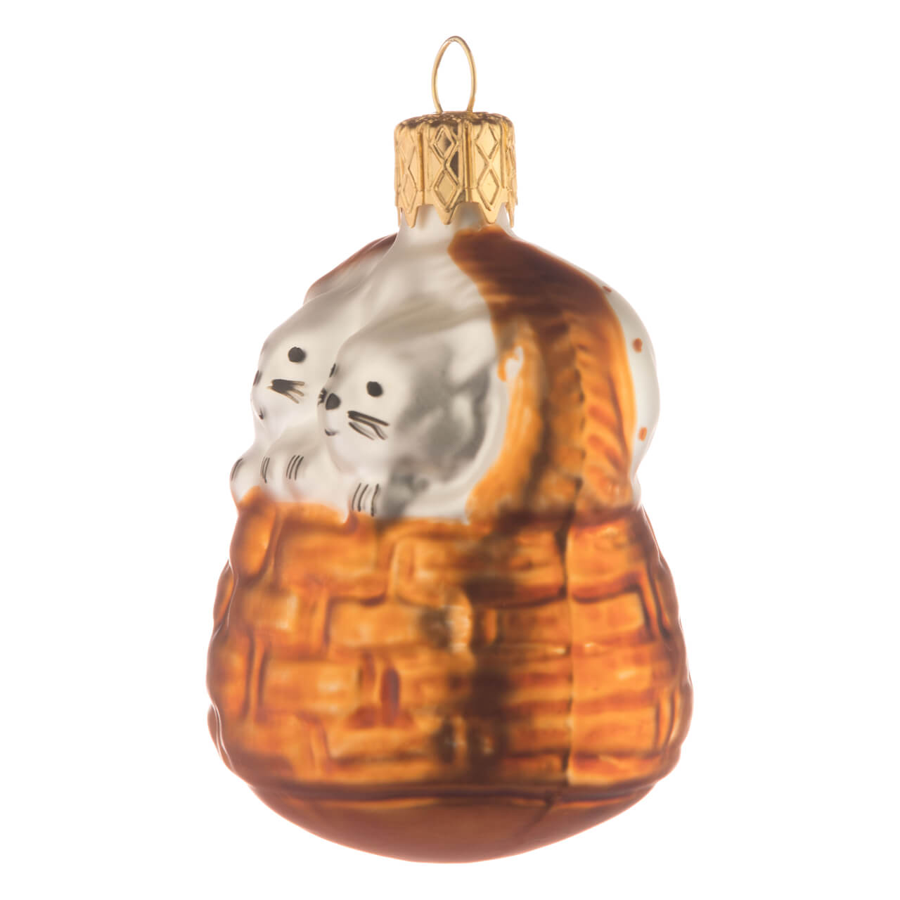 Cette boule, qui peut paraître insignifiante au premier abord, est trop mignonne : Si l'on s'approche d'elle par l'arrière, on ne peut encore rien deviner de grandiose. La corbeille de forme ovale brille d'un brun lumineux avec sa grande anse plate sur laquelle trône la petite couronne dorée de fixation. Le contenu ? Il est bien caché sous une couverture blanche mate, sur laquelle des petits pois ont été amoureusement posés dans le même ton de marron ! Si l'on se rend tout de même sur le devant ... ils nous regardent rapidement et avec curiosité : Deux petits chatons à la fourrure blanche et soyeuse, au joli petit visage, aux moustaches et moustaches bien dessinées, et aux petites griffes délicates sur leurs pattes, avec lesquelles ils s'accrochent au rebord du panier.