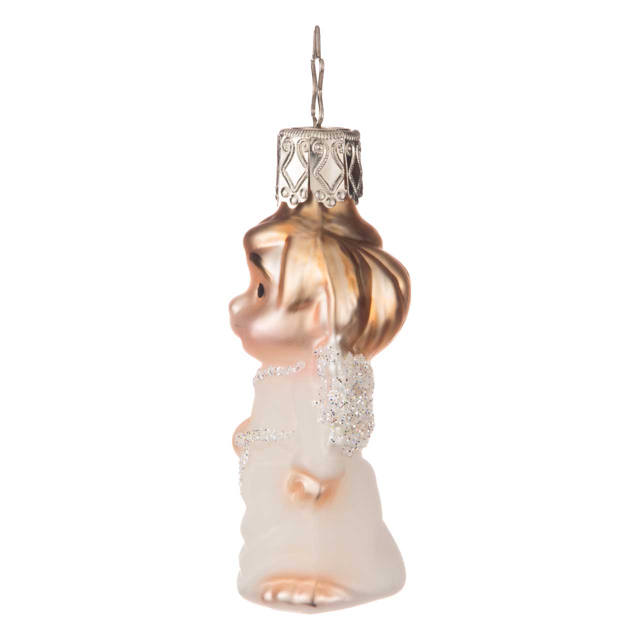 La figurine représente un petit ange d'un blanc délicat avec des accents dorés. Son visage rayonne de gentillesse et de vie, ses ailes sont ornées de paillettes d'argent étincelantes et sa longue robe semble douce et fluide. Une forme ronde et enfantine et les nuances chaudes de la couleur de la peau et des cheveux complètent son apparence affectueuse.