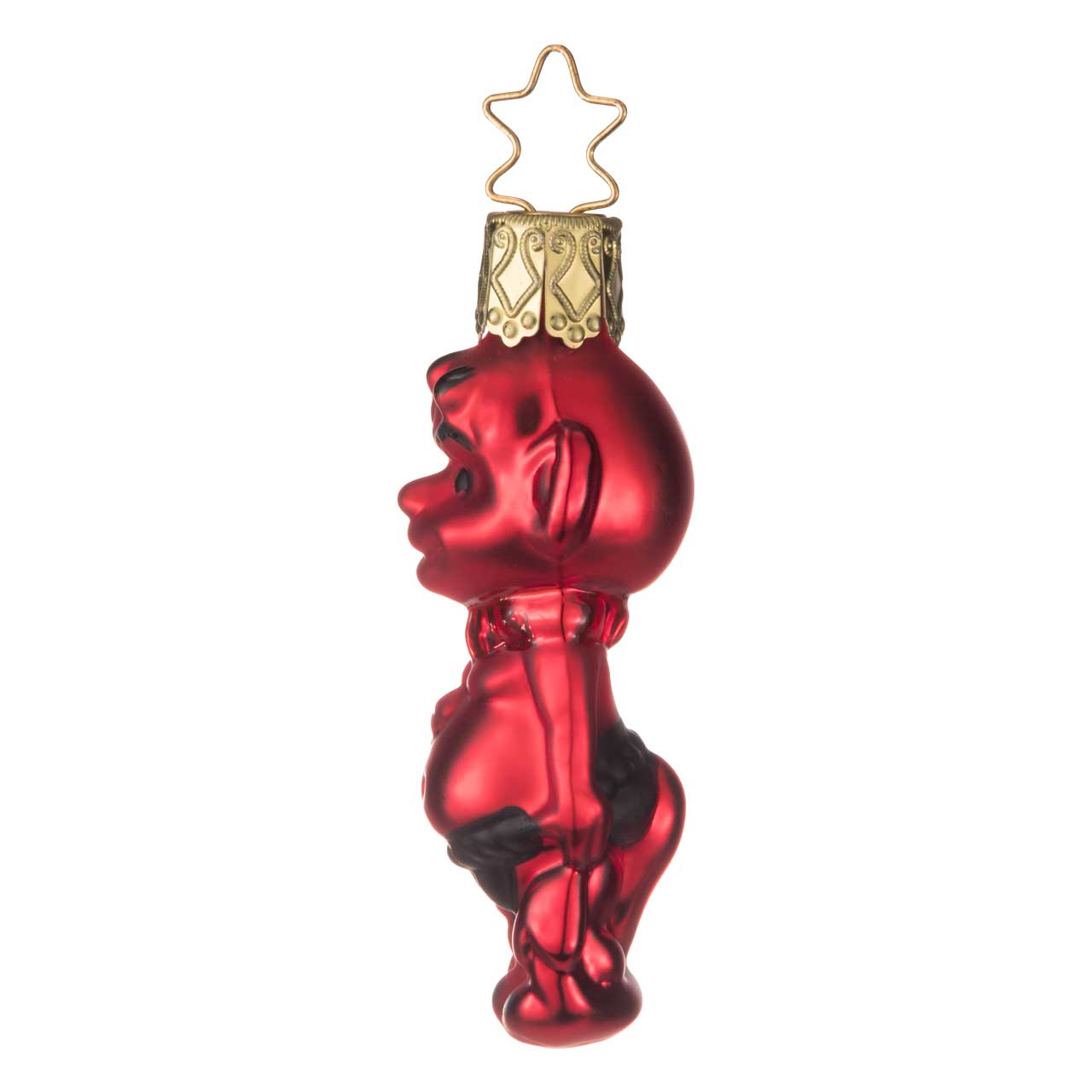 La figurine représente un petit diable d'un rouge vif et brillant, avec des détails noirs sur le pantalon et le collier. Sa forme ronde avec une tête accentuée, un petit ventre et un large sourire lui confère un caractère ludique, presque enfantin. Une pièce frappante qui attire immédiatement l'attention par son contraste de couleurs vives.