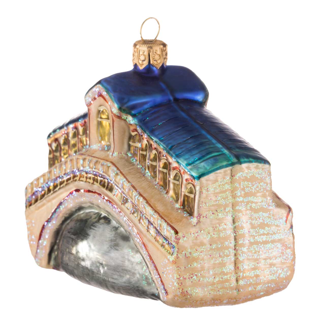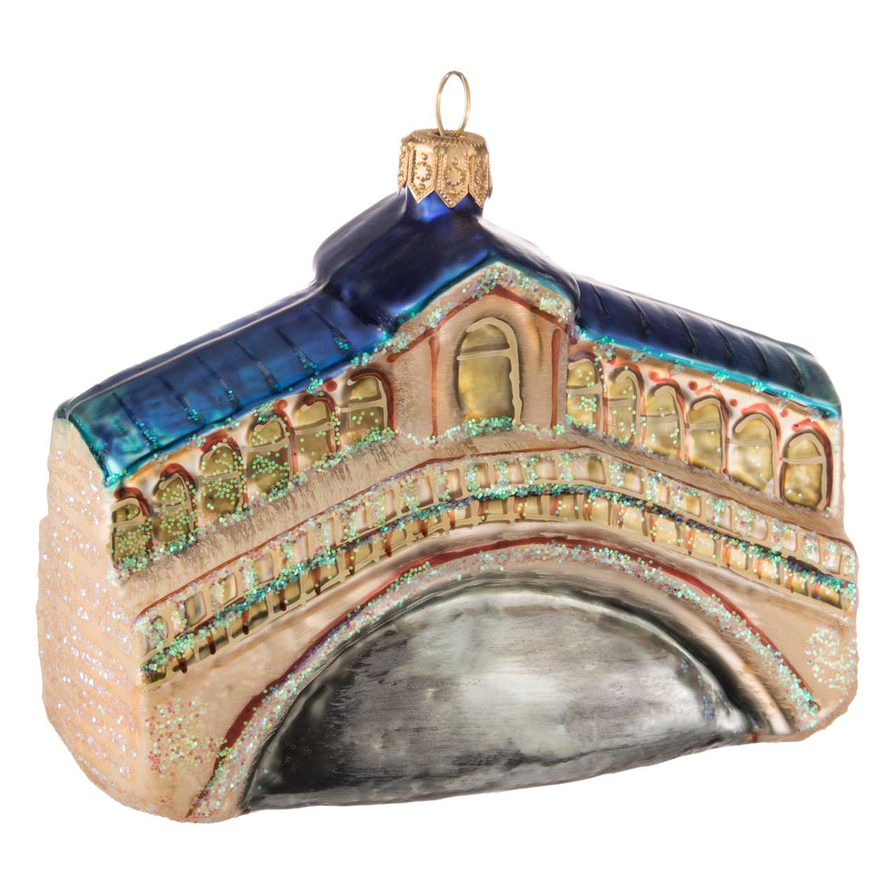 La figure est un peu plus colorée que le pont original. Les murs sont d'un beige chaud et le toit brille d'un bleu maritime. De fines lignes scintillantes laissent deviner la maçonnerie. Les arcs typiques des plafonds voûtés des magasins sont également bien visibles, tout comme les balustrades. L'espace sous l'arche du pont est d'un gris chatoyant qui laisse deviner le passage sur le canal. Vraiment un petit chef-d'œuvre de précision et de simplification.