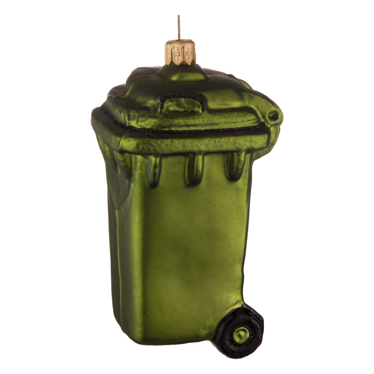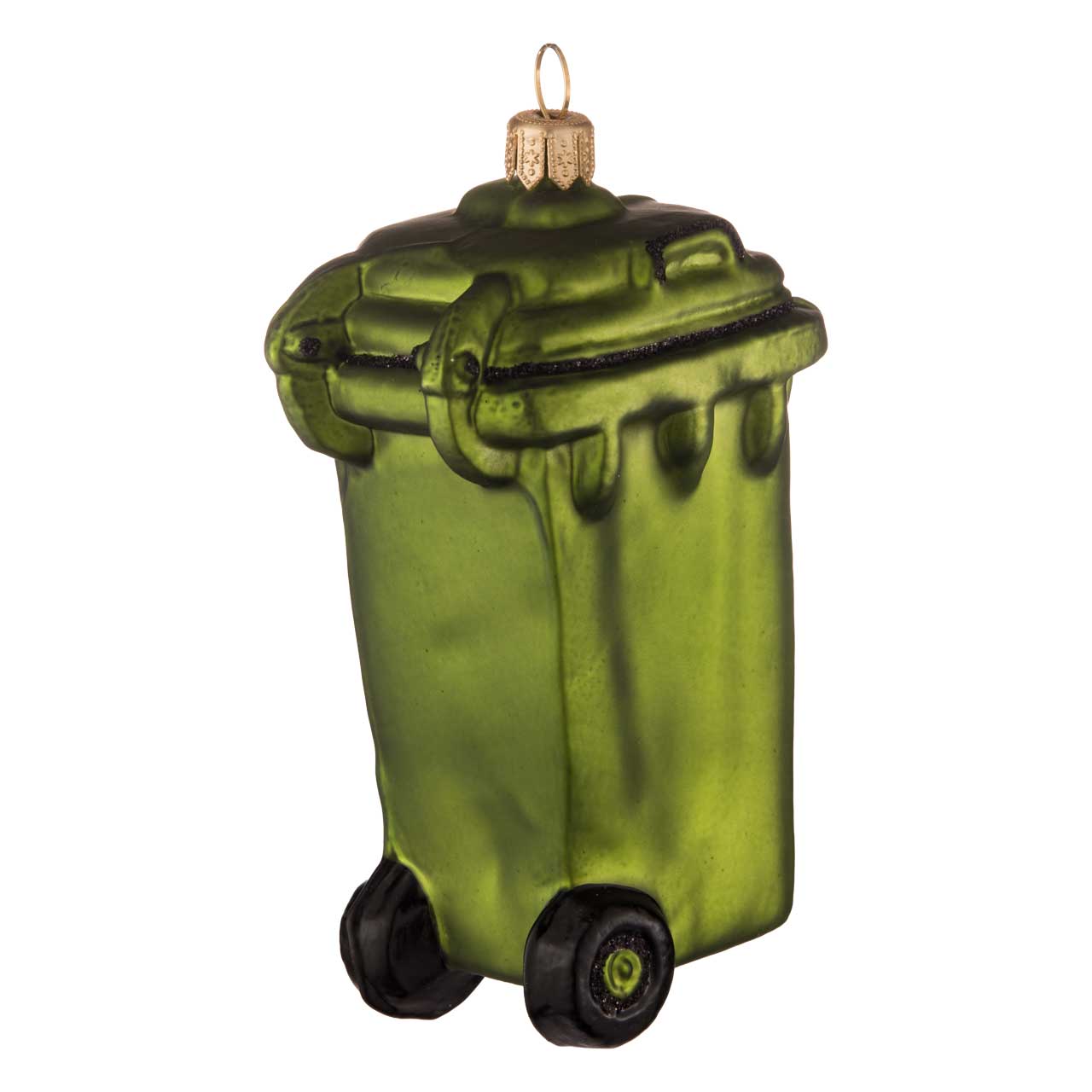 La poubelle est d'un vert discret avec des roulettes noires. La forme se suffit à elle-même, simplement soutenue par quelques lignes noires scintillantes.