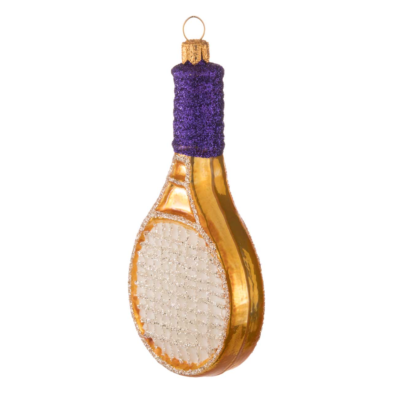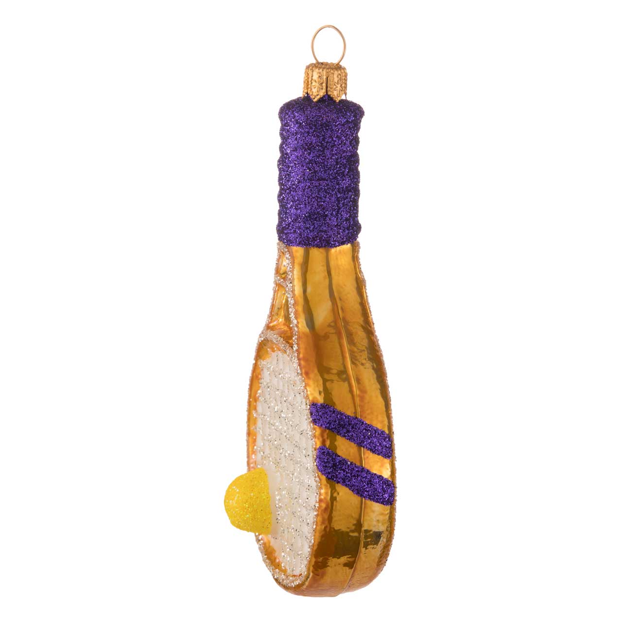 Avec son cadre jaune-orange sportif et son manche violet intense, cet exemplaire brille particulièrement et ne passera pas inaperçu dans un sapin. Les fines lignes de l'entoilage sont tracées avec des paillettes. Une balle de tennis orne l'un des côtés et complète la figure.