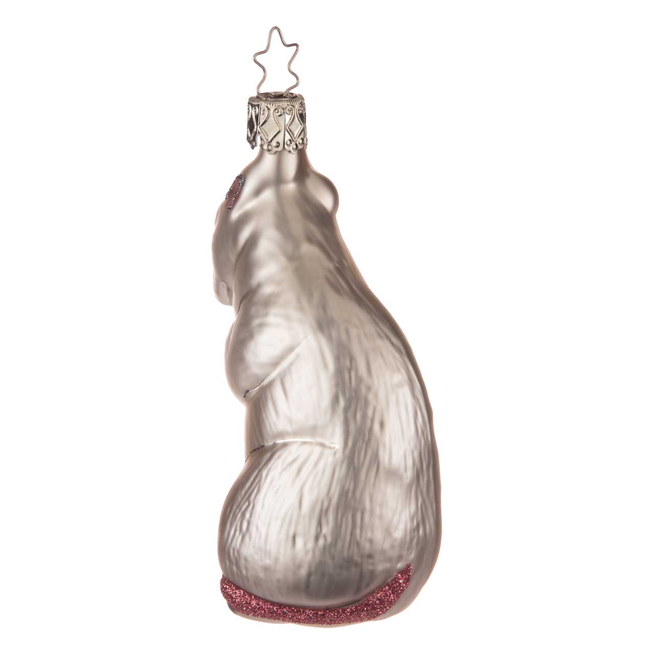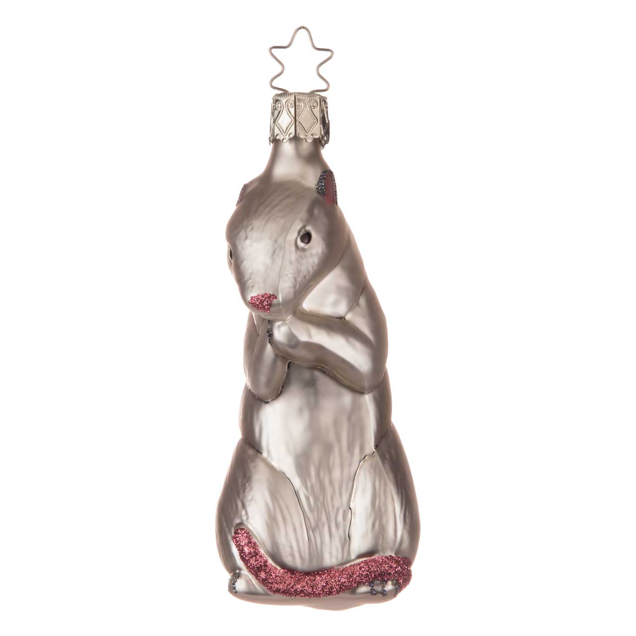 Ici, le rat se montre en position verticale, les pattes jointes - presque comme s'il était en observation silencieuse ou en anticipation. Le pelage est conçu dans des tons gris argentés, tandis que de fins détails comme le nez rose, les oreilles scintillantes et la longue queue rouge étincelante animent l'ensemble. La forme est fidèle à la nature et étroite, avec un corps légèrement incurvé qui donne une impression de vie et d'élégance.