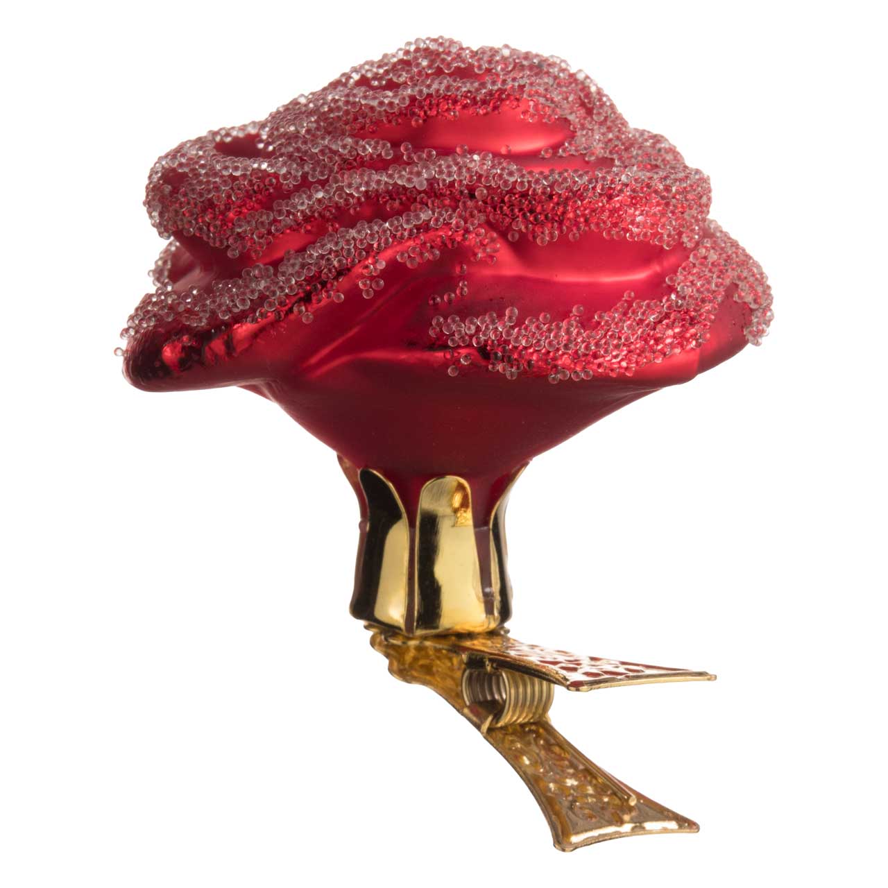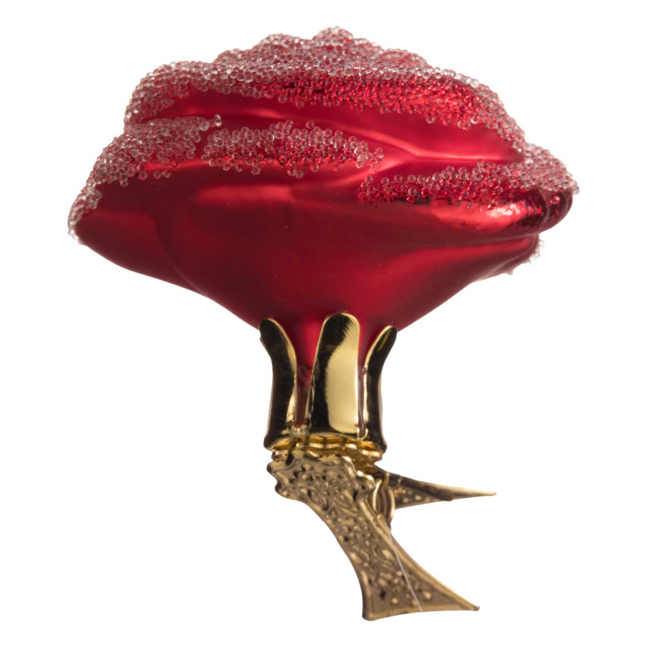 Ce modèle raffiné présente une rose stylisée aux reflets rouge velours et aux pétales finement modelés. De délicates perles de verre sur les bords donnent l'impression que la fleur est recouverte de gouttes de rosée. Le calice doré de la fleur forme un contraste élégant et confère au design une note luxueuse.