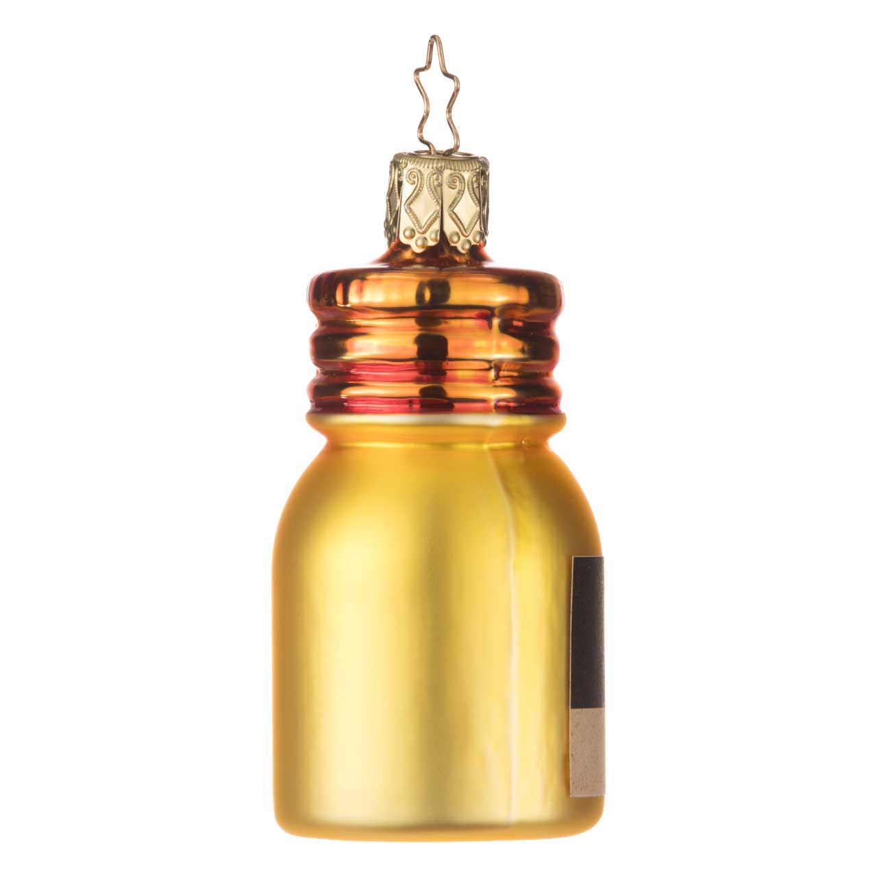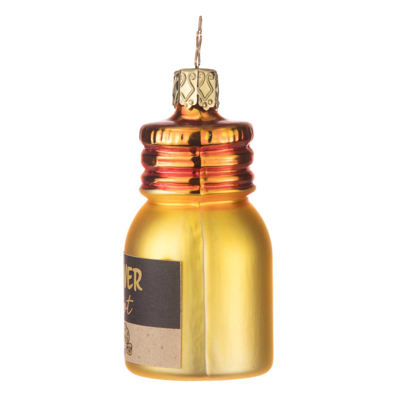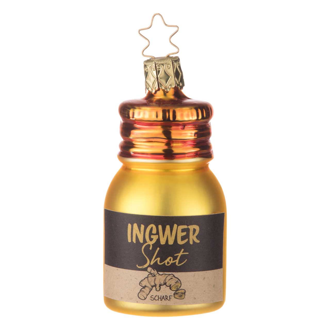 La petite bouteille est arrondie et compacte dans sa partie inférieure, avec un col étagé vers le haut. Le corps brille d'une riche couleur dorée, tandis que le bouchon brille de touches rougeâtres et chatoyantes. Sur la face avant se trouve une étiquette avec l'inscription "Ginger Shot - Scharf" (shooter de gingembre - piquant) et une fine illustration d'une racine de gingembre.