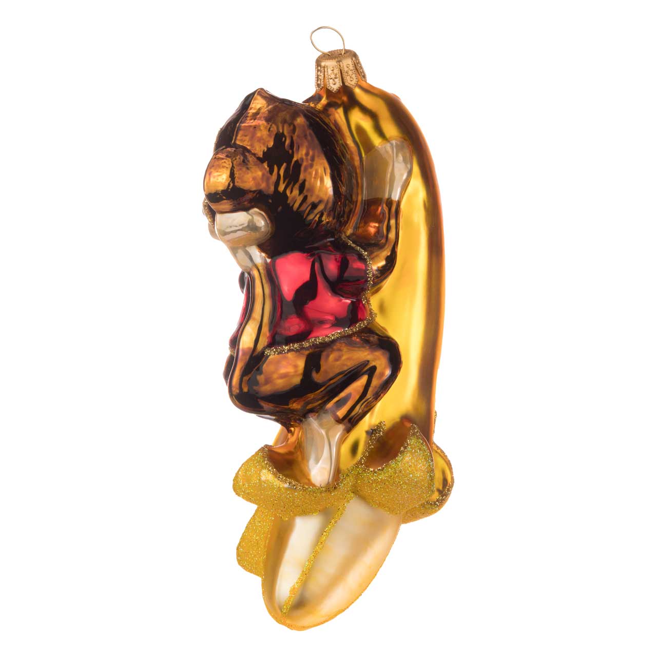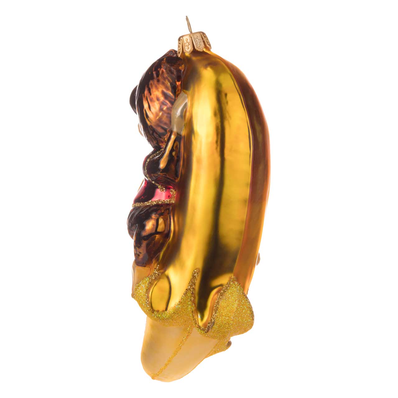 Le petit singe brun se présente dans des couleurs brillantes. Son gilet rouge est bordé d'un liseré doré. La langue à moitié tirée par la joie et les yeux écarquillés, le petit singe nous sourit. La banane à moitié épluchée brille d'un jaune éclatant et présente sa chair jaune tendre dans l'attente de la première bouchée.