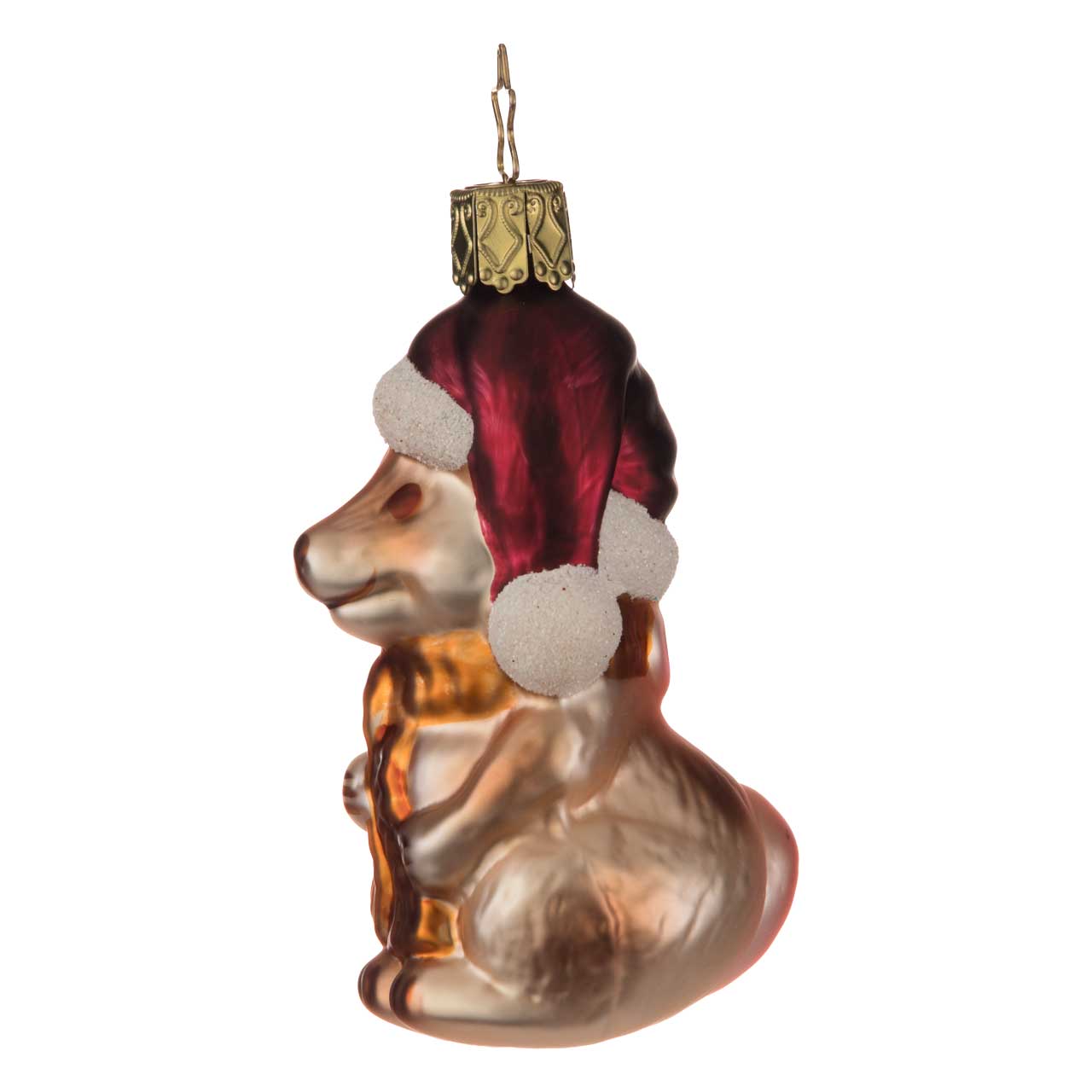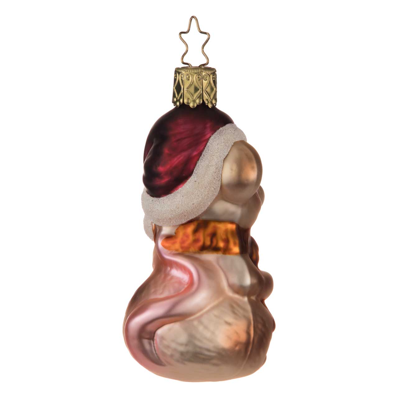 La figurine représente une souris assise dans des tons bruns aux doux reflets, portant un bonnet rouge à garniture blanche et une écharpe jaune d'or. La forme et l'attitude sont sympathiques et ludiques, les couleurs apportent des accents chaleureux de Noël.