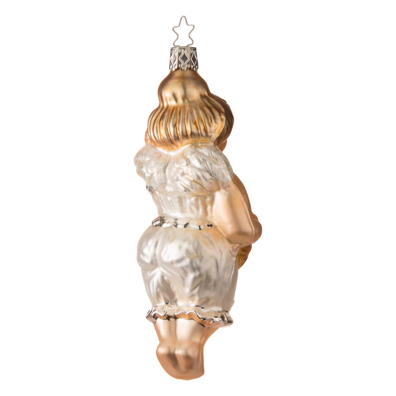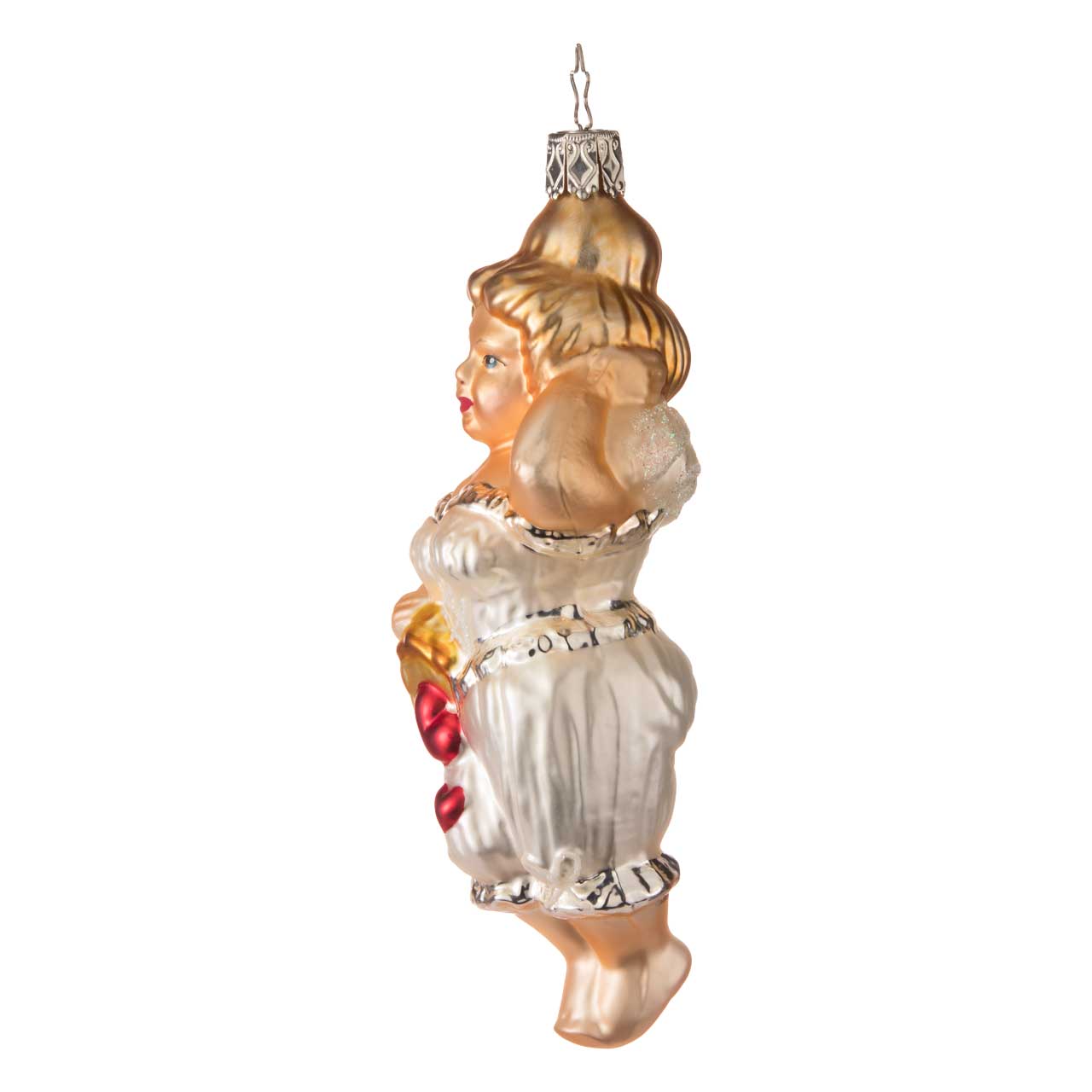 La figure est de forme allongée et montre une silhouette féminine stylisée dans une pose douce. Les couleurs dominantes sont les tons chauds de la peau, une tenue blanc crème ainsi que des accents dorés dans les cheveux et les détails. De petits cœurs rouges créent des contrastes vivants et confèrent à la boule un look charmant et romantique.