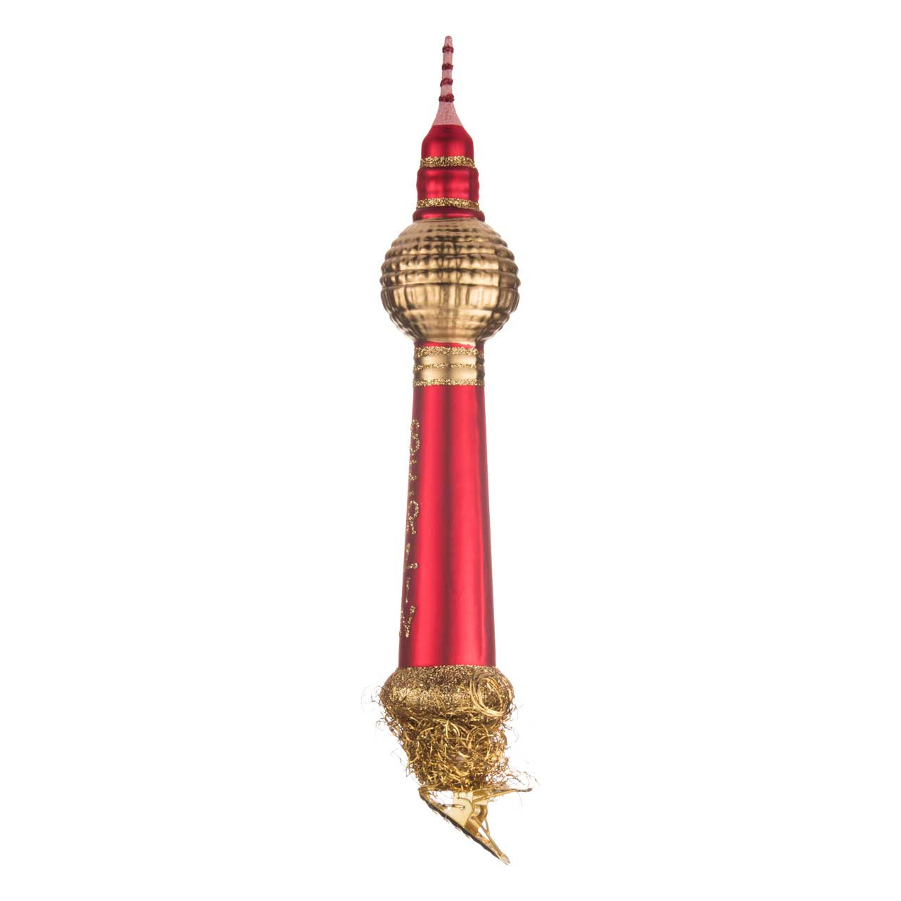 La figurine représente la tour de télévision de Berlin dans une forme élégante et allongée avec une tige rouge et une boule dorée. Des accents dorés scintillants ainsi que l'inscription "Berlin" sur la face avant confèrent à la pièce un air de fête. Un accroche-regard lumineux avec une silhouette claire et élancée en rouge et or.