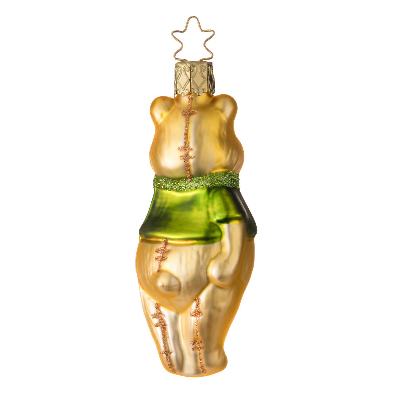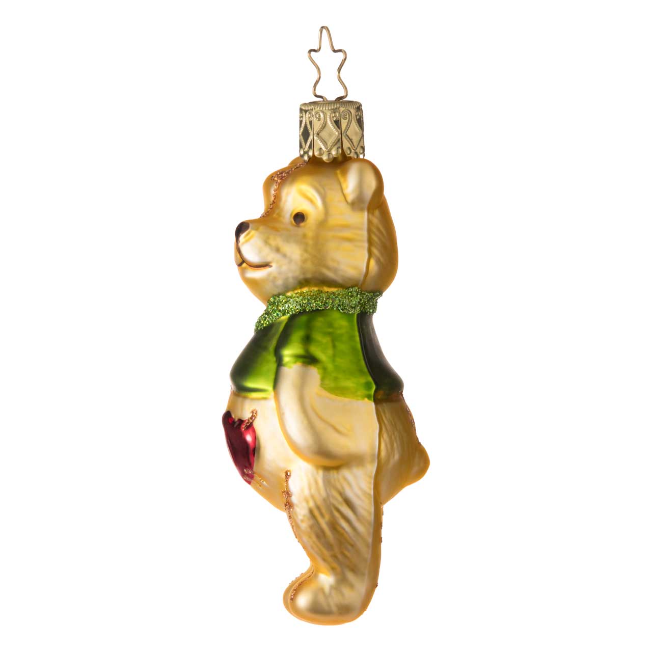 La figurine représente un ours en peluche debout dans des tons dorés chauds, avec un cœur rouge brillant sur le ventre et un haut vert. La forme est travaillée de manière détaillée et plastique, avec de douces rondeurs et de fines touches scintillantes qui confèrent au motif un rayonnement affectueux et nostalgique.
